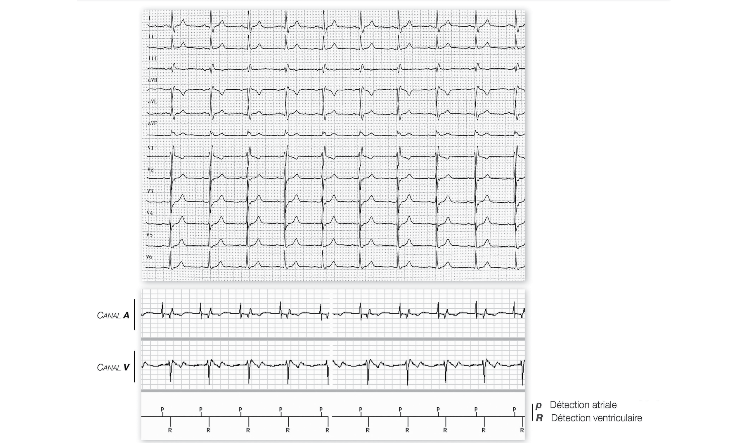 Mode ODO: rythme sinusal à 60 battements/minute; espace PR normal (< 200 ms) et fixe; ventricules spontanés avec aspect de bloc de branche droit (QRS à 140 ms, aspect rSR’ en V1 avec retard de la déflexion intrinsécoïde, onde S large et trainante en V6); le marqueur P correspond à la détection d’une activité atriale spontanée, le marqueur R à la détection d’une activité ventriculaire spontanée; sur le canal atrial, on peut voir l’empreinte du ventricule spontané contemporain de la détection de l’onde R dans le canal ventriculaire; ce signal n’est pas détecté dans le canal atrial;