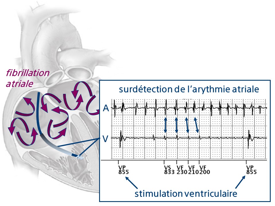 la surdétection d'une arythmie atriale peut causer à la fois la survenue de thérapies inappropriées et d'une asystolie si le patient est dépendant