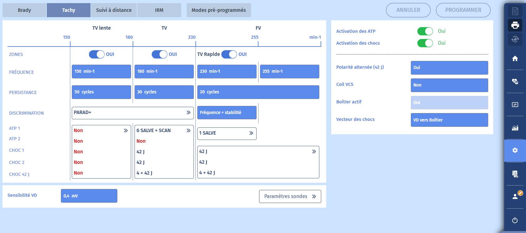 appliquée ; de même, si, en ralentissant, la tachycardie entre dans la zone inférieure (TV), c'est la thérapie supérieure ou égale en terme de niveau d'agressivité qui sera appliquée, la SAT TVR/FV étant considérée comme " plus forte " que la SAT TV/TV