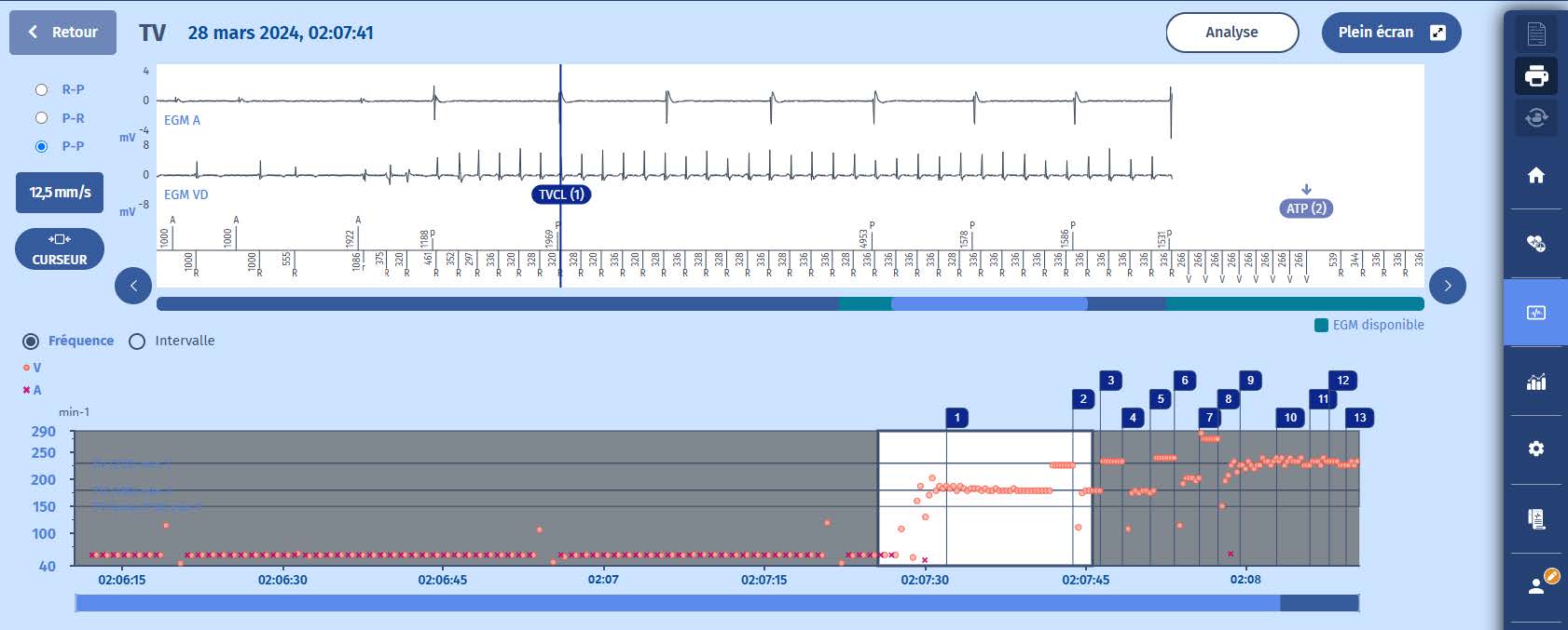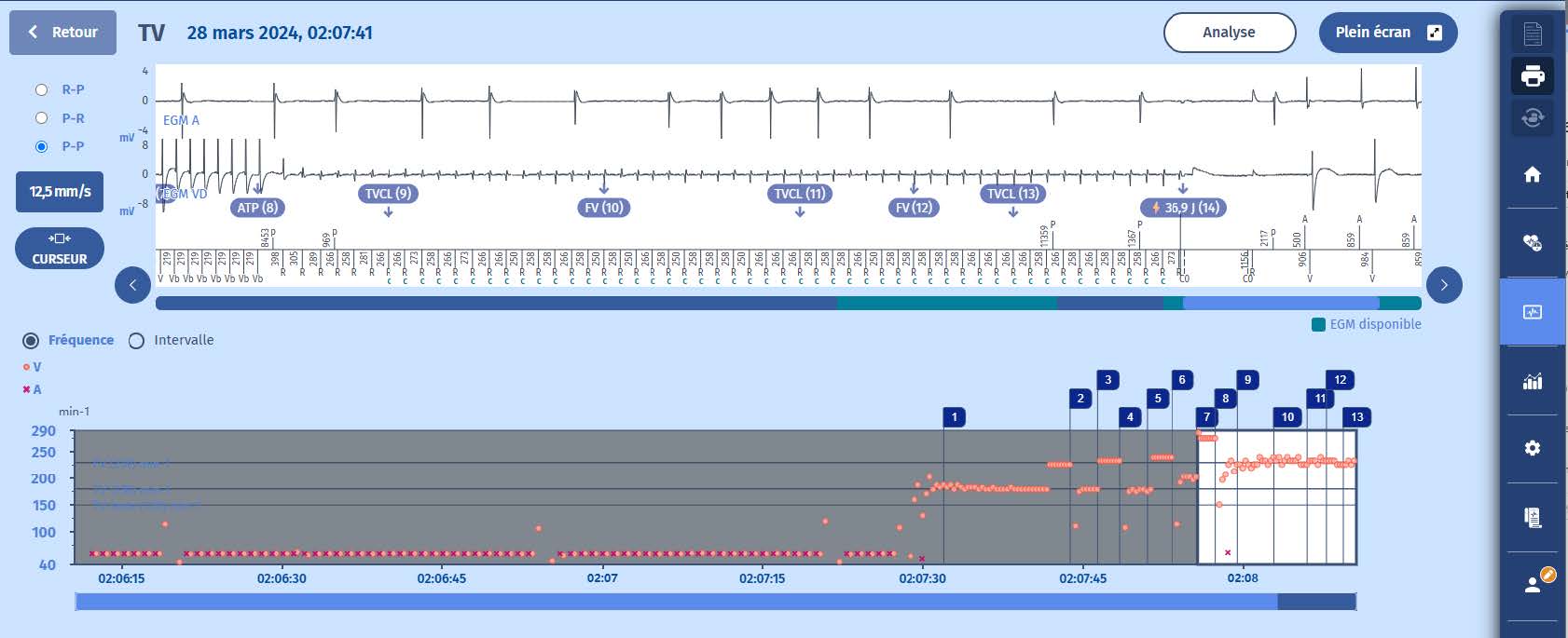 - L'épisode commence par un rythme stable à 60 bpm quand soudain il y a une accélération des cycles ventriculaires dans la zone TV (>180/min).
