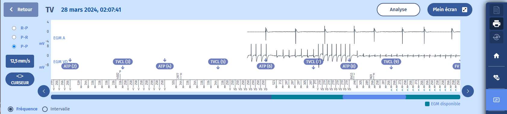 - Le troisième ATP (marqueur : ATP 6) accélère la TV, les cycles passant de >330 ms à <300 ms, mais ils sont toujours dans la zone de TV avec la délivrance d'une quatrième salve à la longueur de cycle la plus courte possible : 220 ms.