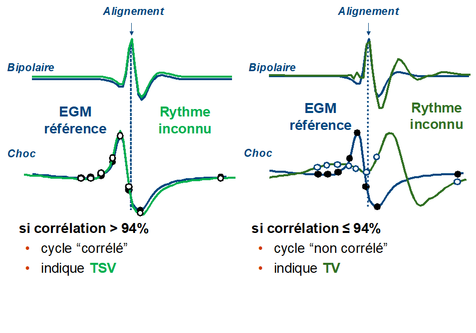- absence de corrélation entre la morphologie des ventriculogrammes en tachycardie et la morphologie de référence (RhythmID corrélé : Faux)