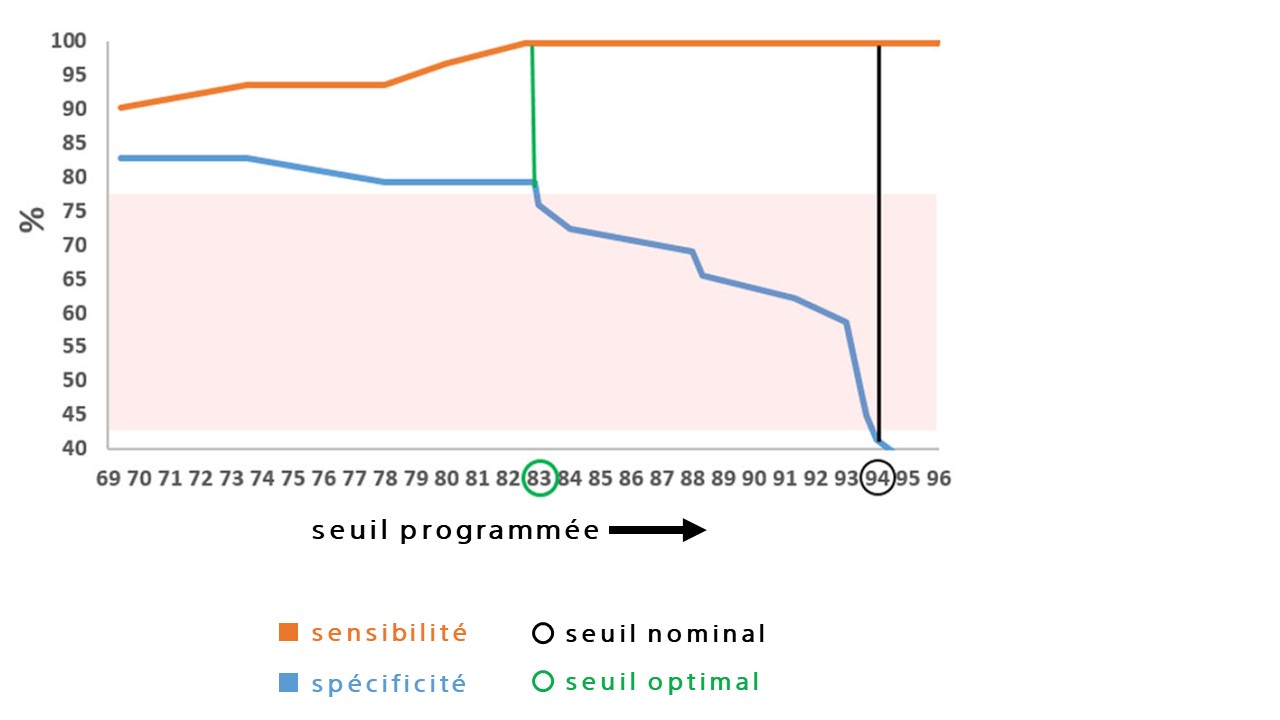 Cette figure illustre les différences en termes de spécificité en fonction de la valeur du seuil programmé ; la sensibilité reste à 100% jusqu'à une valeur du seuil de 83%