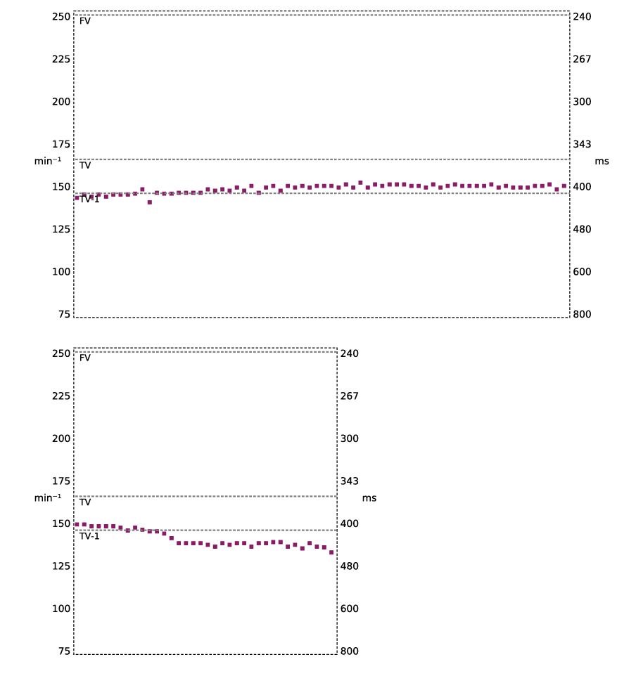 lors des interrogations de suivi, il est possible de vérifier que le pourcentage de concordance entre les ventricules spontanés conduits détectés lors de la consultation et le ventriculogramme de référence est élevé (supérieur au seuil programmé et aussi proche de 100% que possible)