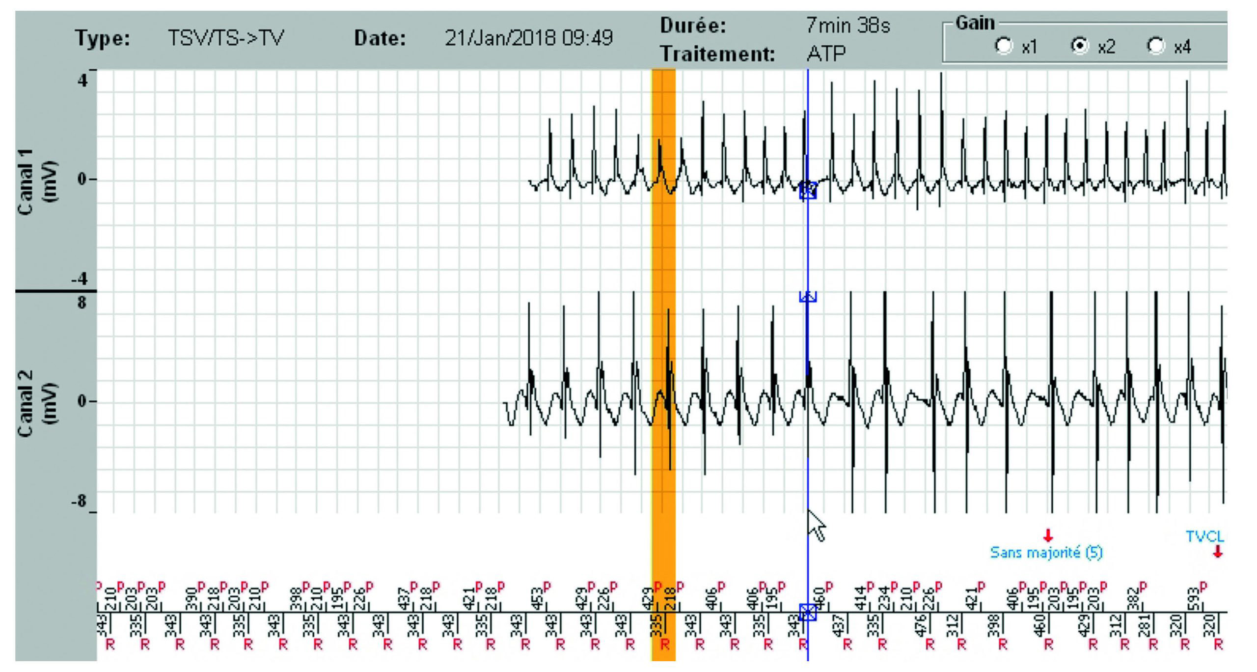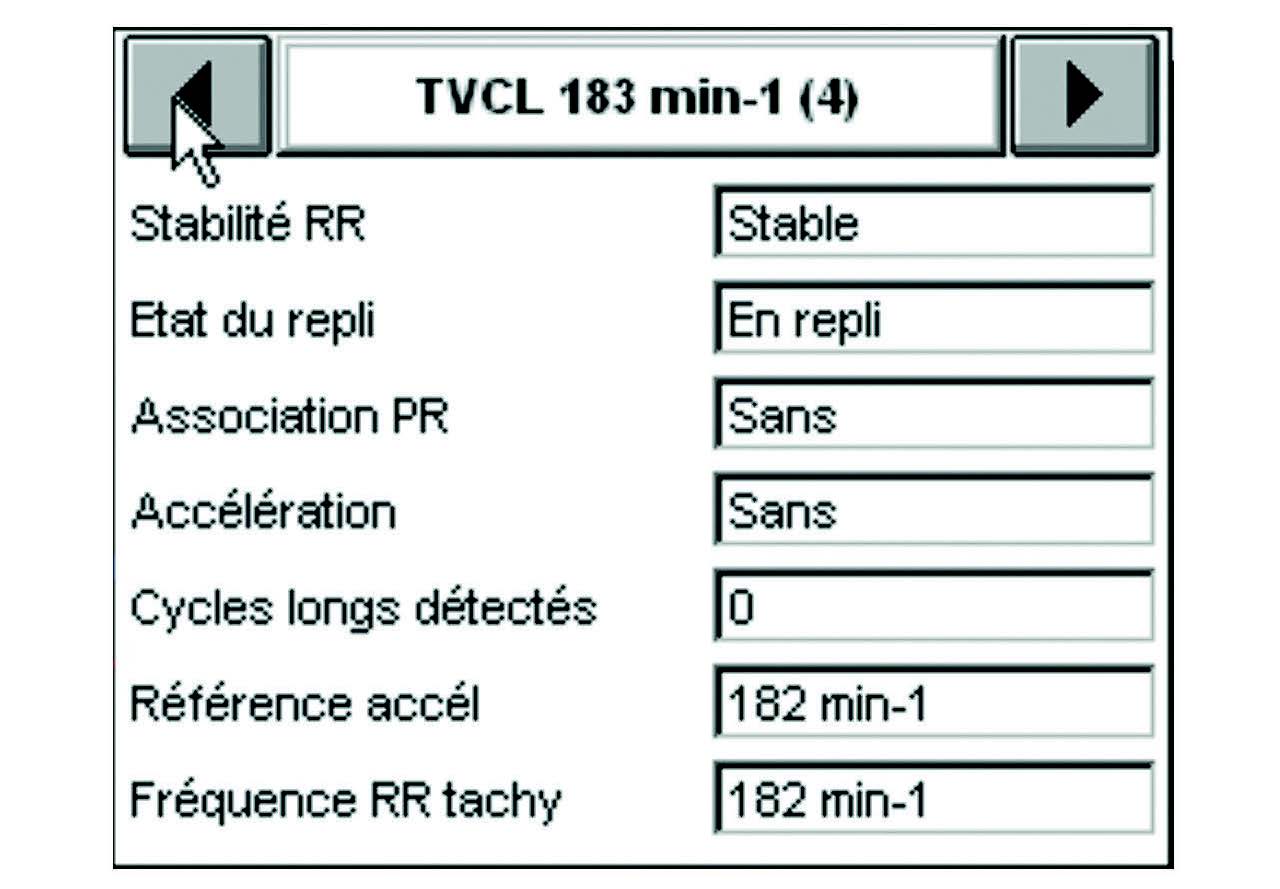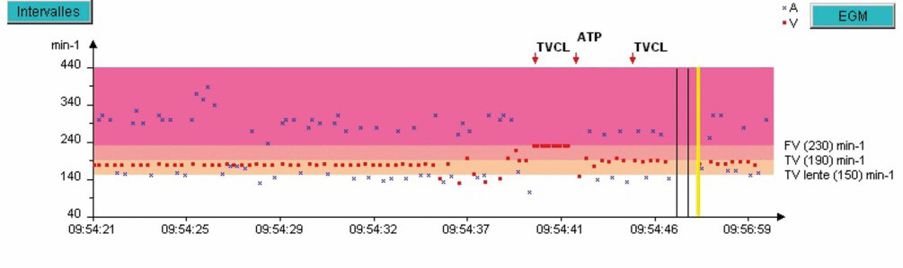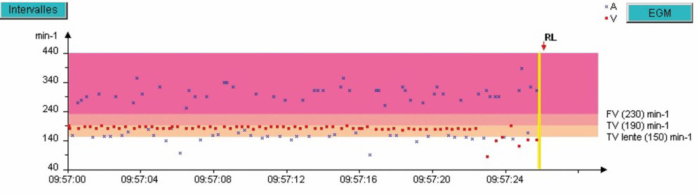 L'épisode a duré 7 minutes et 38 secondes et le tachogramme ci-dessous ne montre que les 3dernières minutes. Pendant les 4 minutes et 30 secondes précédentes, la fréquence ventriculaireest parfaitement stable dans la zone de TV lente.