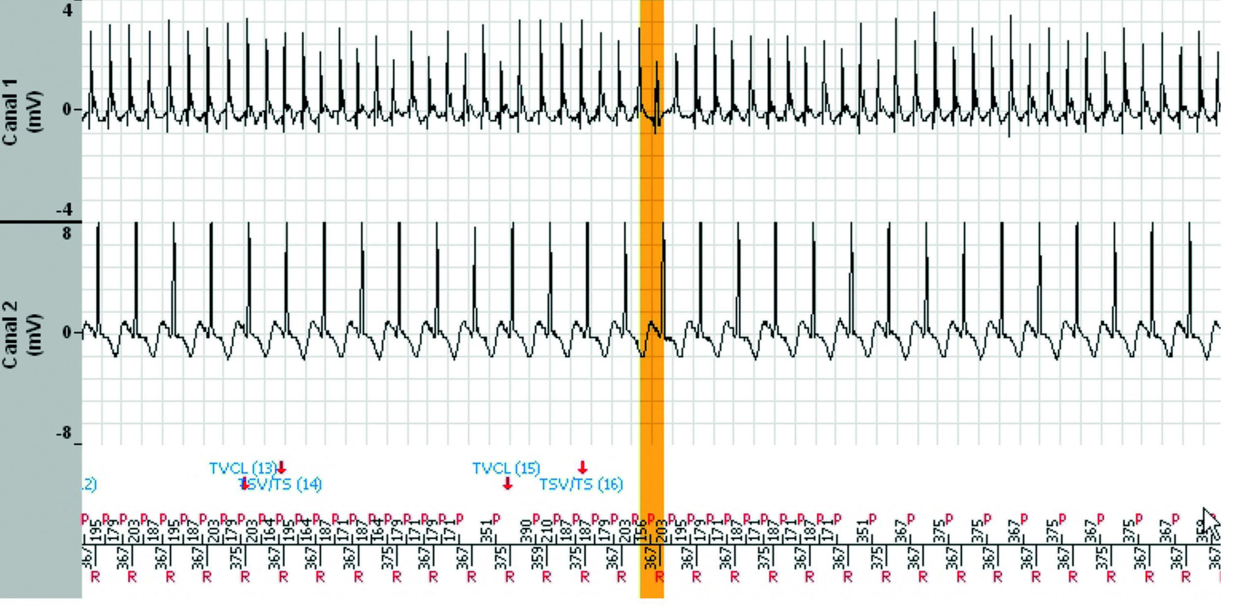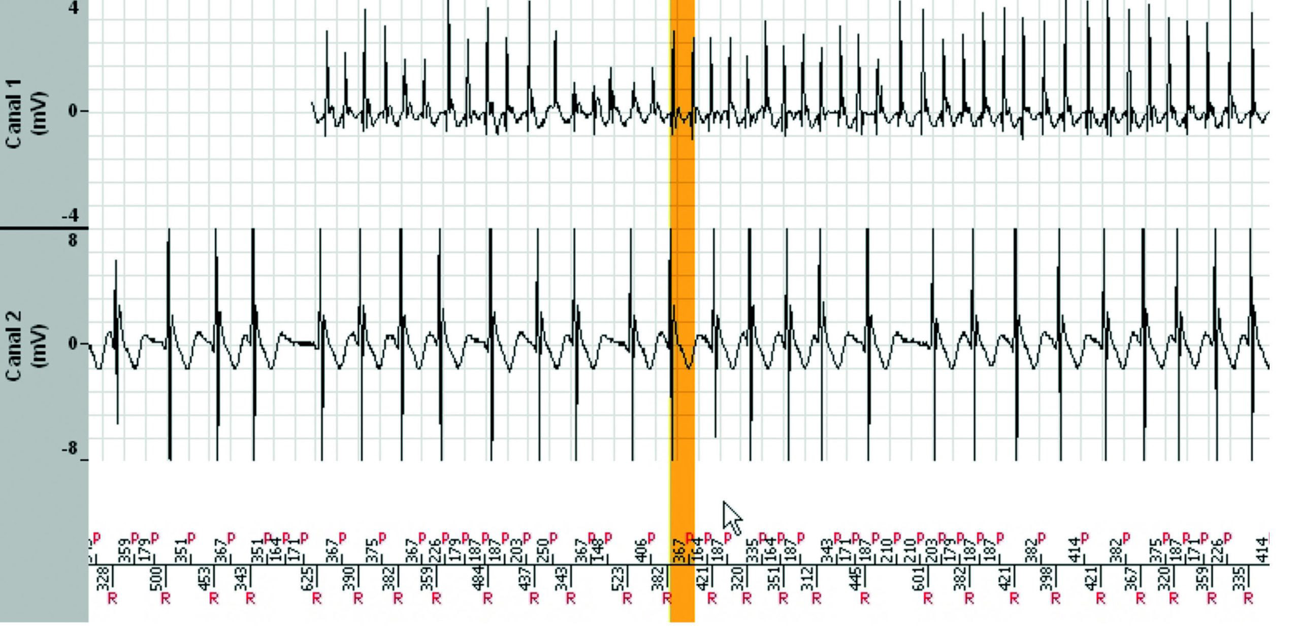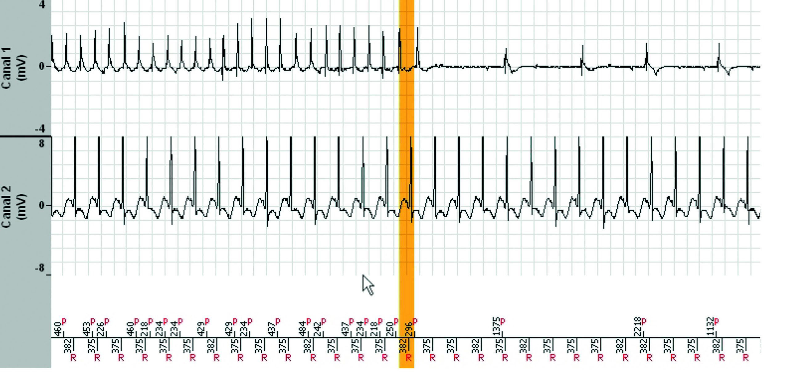 L'épisode a duré 7 minutes et 38 secondes et le tachogramme ci-dessous ne montre que les 3dernières minutes. Pendant les 4 minutes et 30 secondes précédentes, la fréquence ventriculaireest parfaitement stable dans la zone de TV lente.