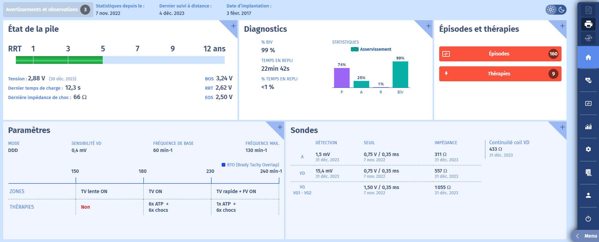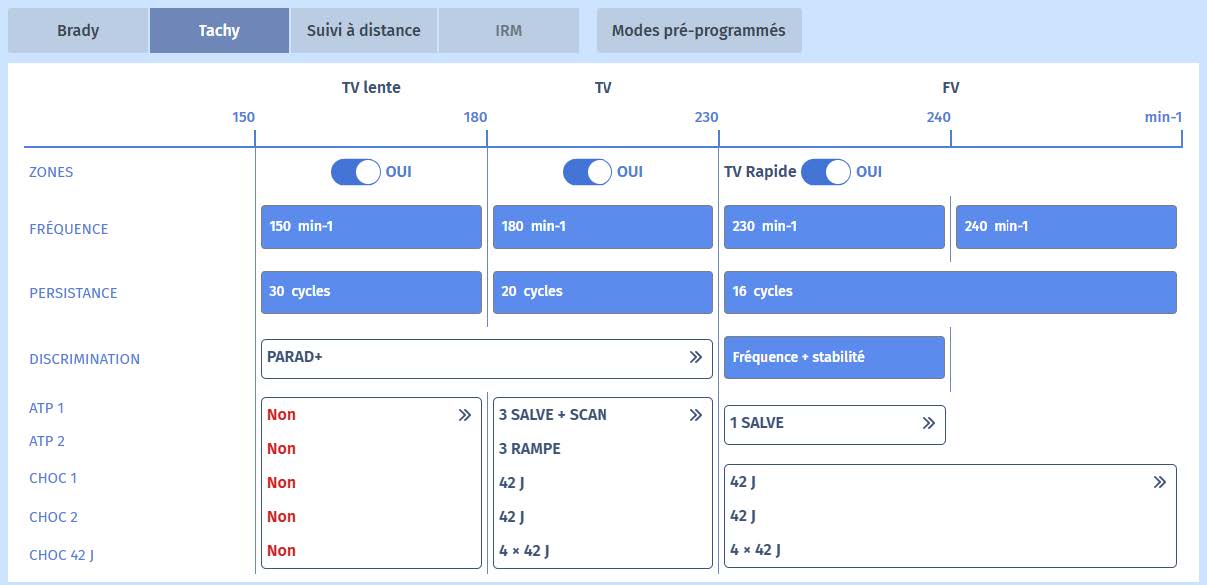 min et que le compteur de TV se remplit, de même que le compteur de persistance. Les cycles lents prolongent le traitement en raison de l'extension du compteur de persistance de 10 cycles. Chez ce patient, il y a un seul épisode de surdétection de l'onde T armi de nombreux épisodes d'arythmie ventriculaire réelle. Aucun changement de programmation n'a été effectué. Les solutions au surdétection de l'onde T ne sont pas nombreuses. La modification de la sensibilité est souvent la première solution envisagée, mais elle peut également compromettre la capacité du DAI à détecter correctement les signaux de FV, en particulier lorsque l'amplitude de l'onde R est faible. La modification des zones n'est souvent d'aucune utilité car les compteurs de TV/FV sont remplis à un rythme élevé (y compris dans ce cas). Le véritable danger de la surdétection de l'onde T est qu'elle peut délivrer un choc sur l'onde T (le DAI considérant qu'il s'agit d'un événement ventriculaire rapide sur lequel il devrait délivrer le choc), avec des résultats potentiellement catastrophiques (induisant une véritable FV qui peut être difficile à défibriller). Dans certaines marques présentant un risque plus élevé de surdétection de l'onde T, d'autres modifications de programmation peuvent être envisagées (modification du vecteur de détection, modification des paramètres de détection adaptatifs), mais dans certains cas, une nouvelle sonde VD doit être placée pour résoudre le problème.