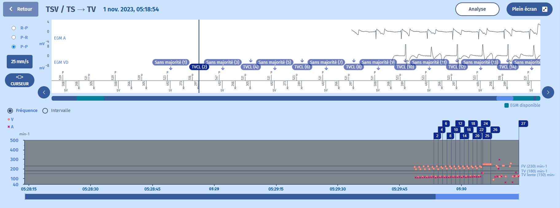 Le rythme de base est la détection auriculaire (tachycardie sinusale) et la stimulation biventriculaire. Tout au long de l'épisode, on observe un certain pattern. Il commence par des ondes T surdétectées après la stimulation biventriculaire. Ces cycles courts empêchent la stimulation biventriculaire après le cycle auriculaire suivant et nous observons une conduction auriculo-ventriculaire intrinsèque. Le cycle suivant permet à nouveau le suivi biventriculaire et nous observons à nouveau une surdétection de l'onde T. Ce pattern se répète lors de l'accélération de la stimulation biventriculaire. Ce pattern se répète pendant l'accélération du rythme sinusal, ce qui rend également le cycle après le dépassement de l'onde T suffisamment rapide pour remplir le compteur de TV. Il est intéressant de noter que le rythme est considéré comme stable car la majorité (6/8) est effectivement stable. Nous voyons beaucoup de marqueurs TVCL sans thérapie parce que les cycles lents changent le diagnostic en “Pas de majorité” et ils prolongent