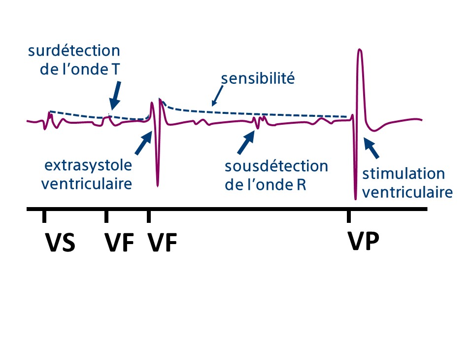 une surdétection de l'onde T est associée avec un aspect typique d'alternance entre 2 signaux morphologiquement différents, un signal à haute fréquence (onde R) et un signal à basse fréquence (onde T) ; le dispositif compte, pour chaque cycle cardiaque, l'onde R et l'onde T comme un second signal supplémentaire entraînant un doublement de la fréquence cardiaque ; l'alternance de la durée des cycles (intervalles RT et intervalles TR) est généralement marquée pour des fréquences lentes (intervalles RT courts et TR longs) mais est souvent moindre à l'effort (intervalles RT et TR à peu près équivalents) ou pour les patients avec QT long