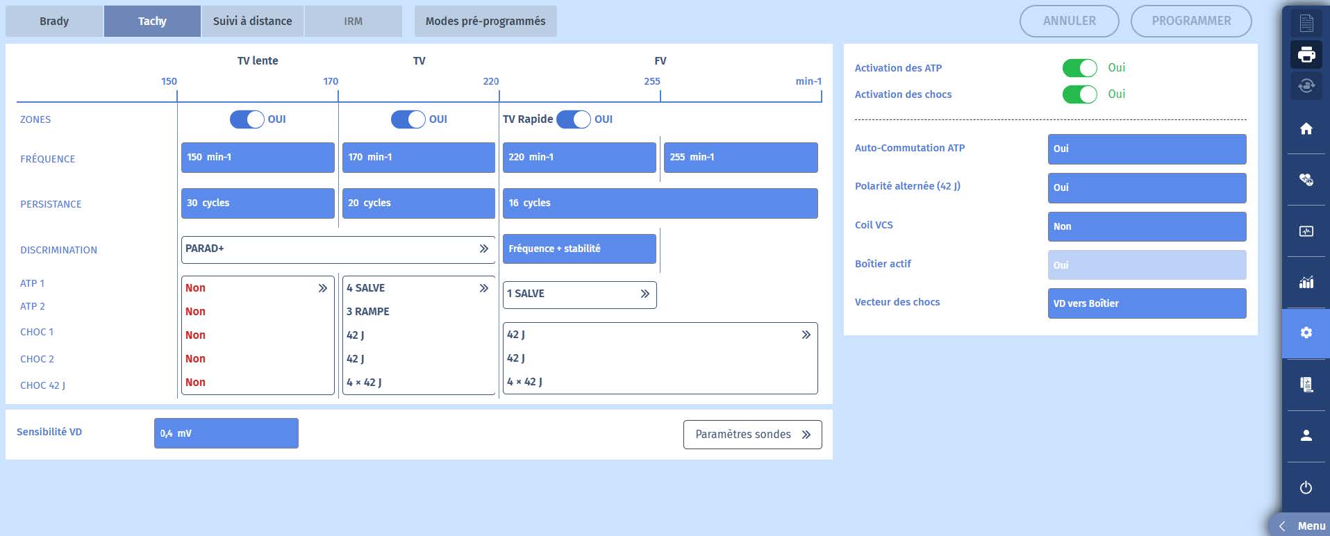 Un homme de 66 ans a été implanté d'un Platinium DR en prévention secondaire. Il s'agit d'un patient qui présente des antécédents de cardiopathie ischémique avec FEVG à 28%. Il a des QRS fins. Il vient pour un suivi de routine. Il est asymptomatique.