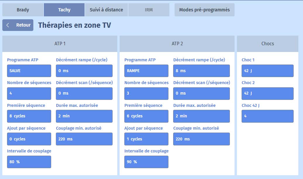 Le premier traitement déclenché est le premier traitement programmé pour la zone désignée de la tachycardie, ou celui déterminé précédemment par la fonction ATP Autoswitch.