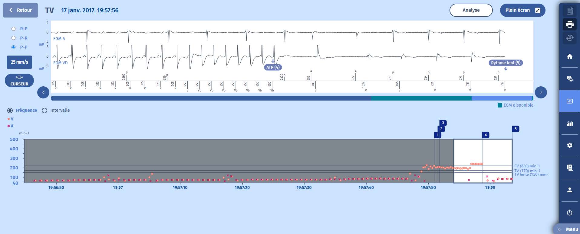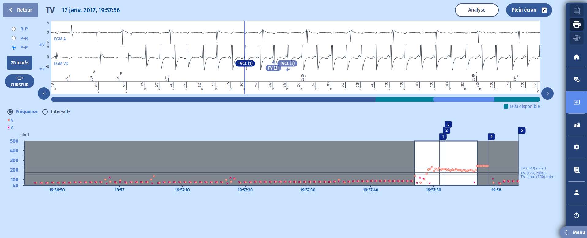 2 Une tachycardie commence, de nature ventriculaire puisque la fréquence auriculaire reste lente. Il y a quelques cycles dans la zone de FV bien que le rythme soit principalement de la TV avec un premier marqueur VTLC et donc une persistance de 20 cycles est lancée.