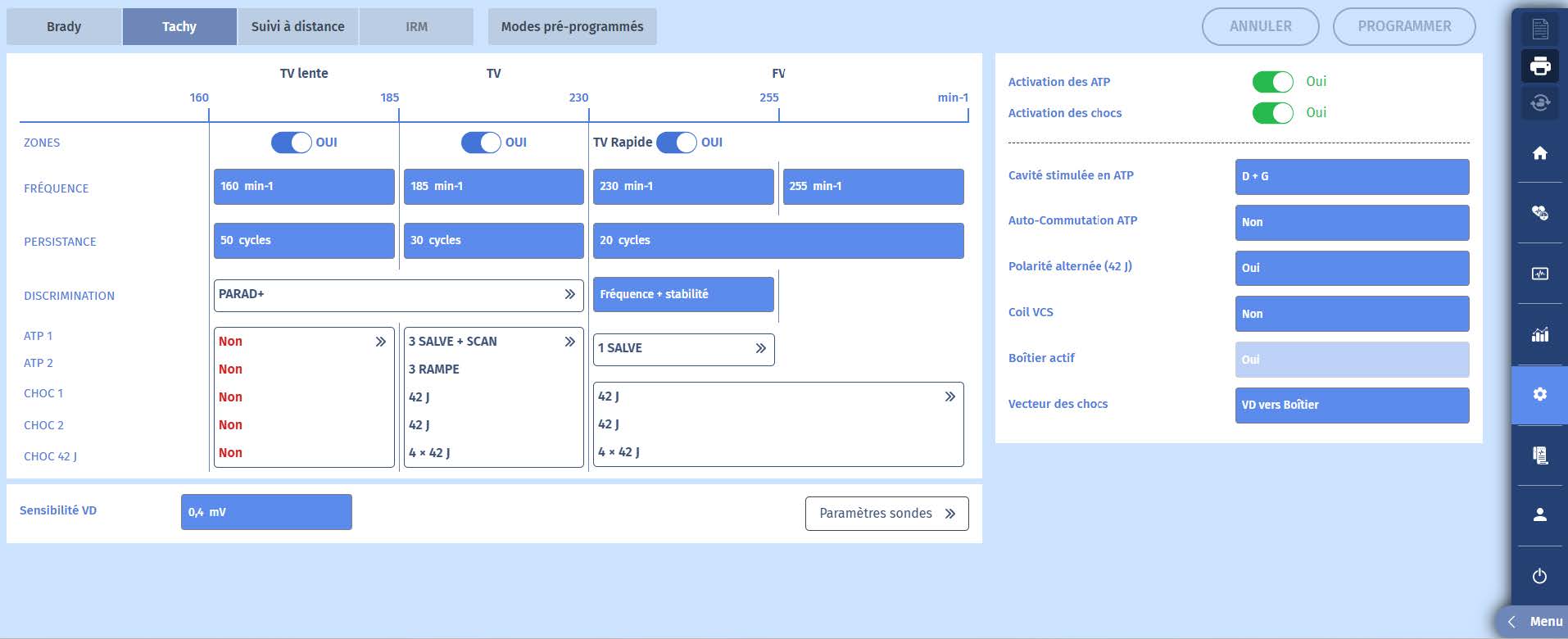 3 Une fois la charge des condensateurs terminée (42 J), le choc (37,7 J) est délivré après un cycle de confirmation qui se déroule également dans la zone de FV. Le rythme lent est rétabli avec la détection auriculaire et la stimulation biventriculaire.