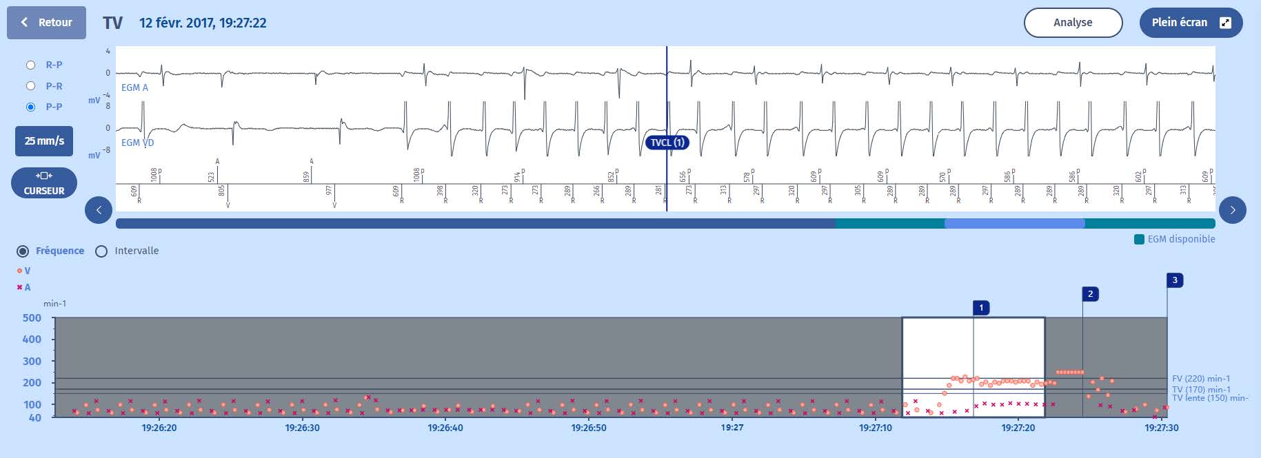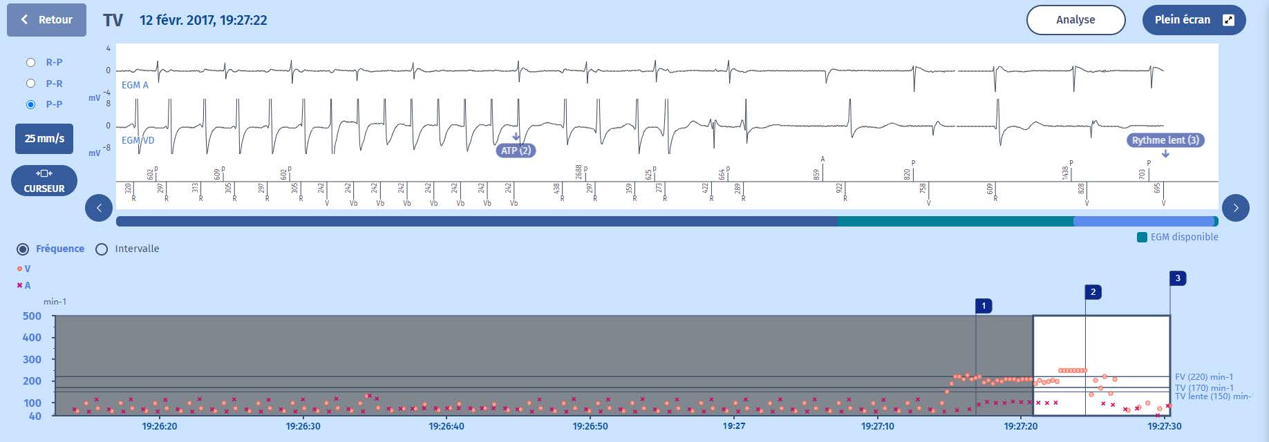 - Ce cas illustre le décompte des cycles pendant la tachycardie avec une incrémentation. Ce tracé révèle le bon comportement d'analyse du défibrillateur : le décompteest simple, la discrimination a correctement amené au diagnostic de TV avec une