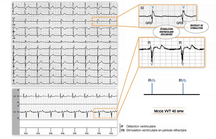 Mode VVT 40 battements/minute: stimulation ventriculaire (Vb) déclenchée par une détection ventriculaire (R); de façon encore plus évidente que dans l’oreillette chez ce patient, la détection des QRS est tardive dans l’onde R’ en raison du bloc de branche droit, la sonde étant implantée dans le ventricule droit. Tracé 6: Mode VVT 40 Battements/minute