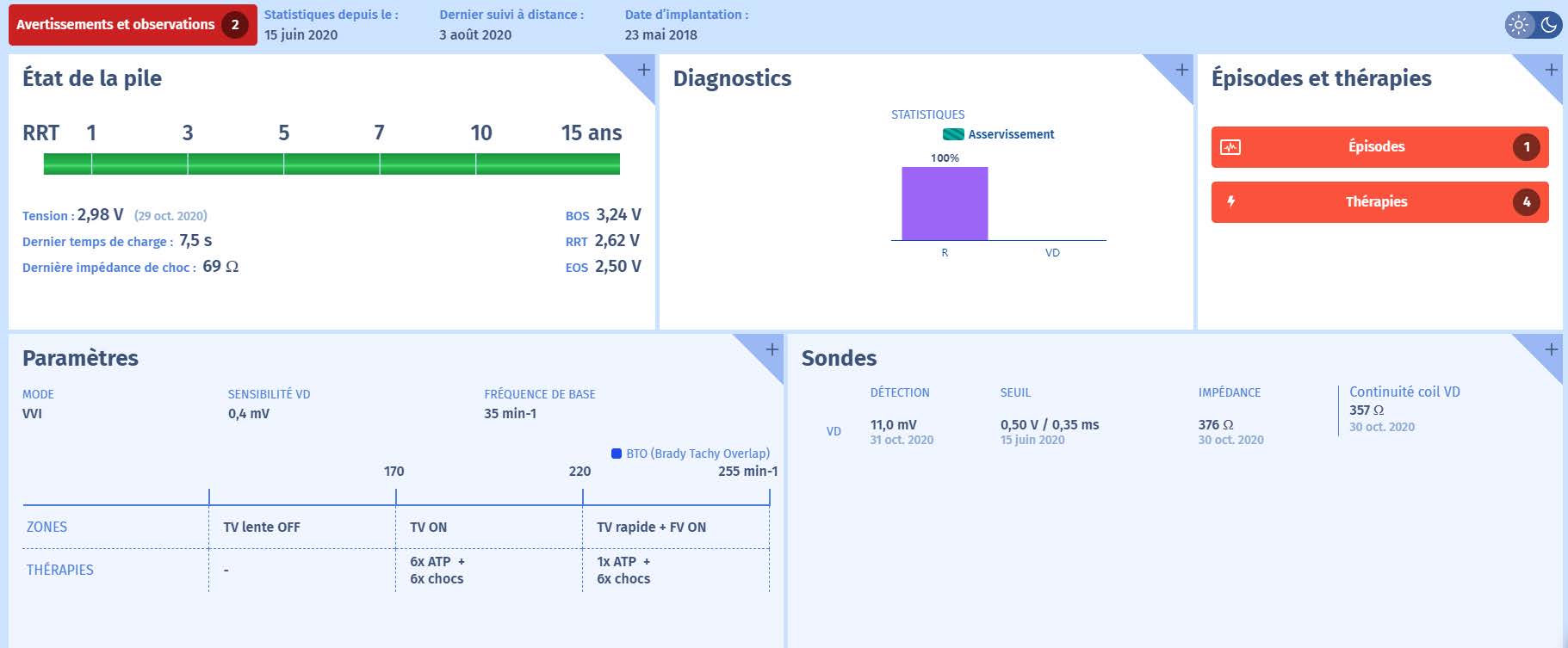 Il s'agit d'un épisode long, de sorte que seules des bribes d'EGM sont disponibles, mais il présenteles mêmes caractéristiques que celles observées dans le tracé de l'intervalle, à savoir l'apparition d'événements ventriculaires de plus en plus rapides. Comme il s'agit d'un DAI simple chambre avec une seule sonde ventriculaire, nous ne voyons pas de canal auriculaire. Là où nous verrions normalement un canal auriculaire, nous voyons maintenant un canal far field entre le boitier et la bobine RV, qui est similaire à un ECG de surface. Sur ce canal, nous pouvons apprécier davantage la morphologie du QRS et la comparer à d'autres épisodes ou à l'EGM en direct qui, dans ce cas, est identique. Cela confirme le diagnostic de thérapies inappropriées pour une tachycardie