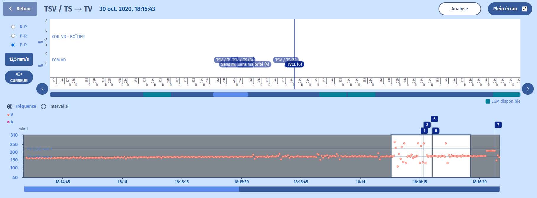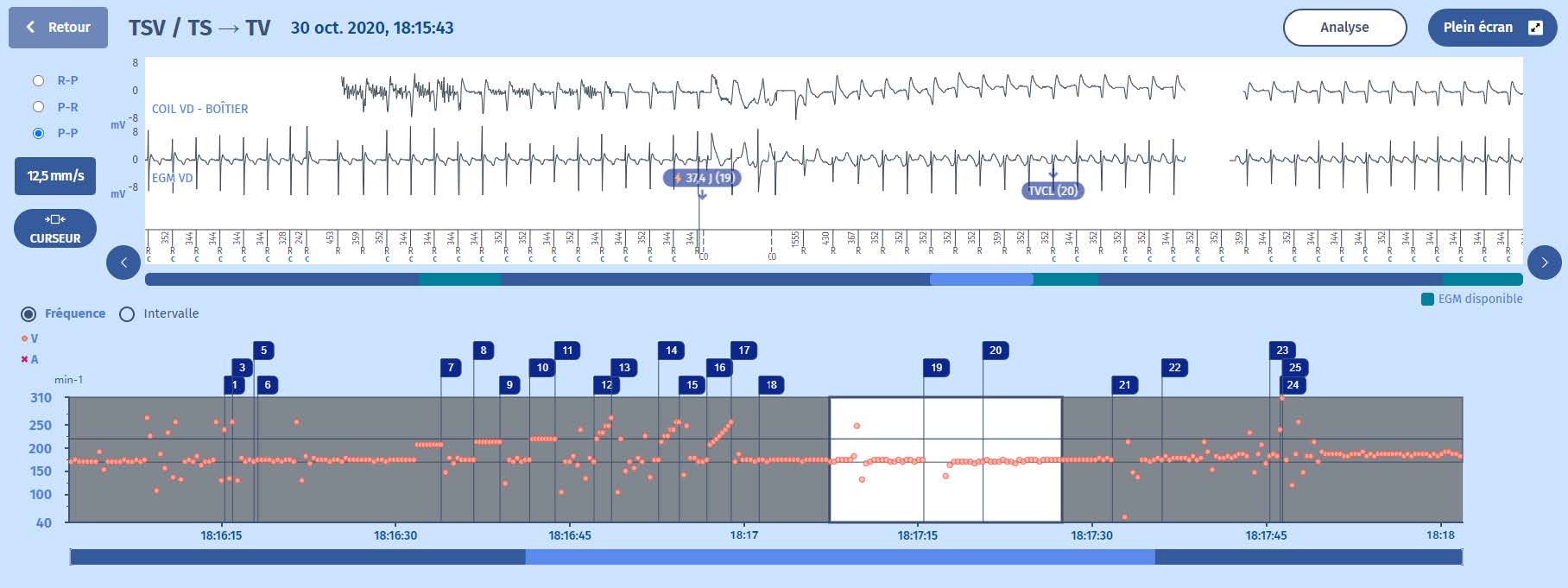 En bas des deux figures, on peut apprécier l'apparition progressive de la tachycardie et le glissement vers la zone de TV. C'est le cas le plus typique de la tachycardie sinusale. Après différents marqueurs, nous voyons les thérapies administrées : salves, rampes et chocs.