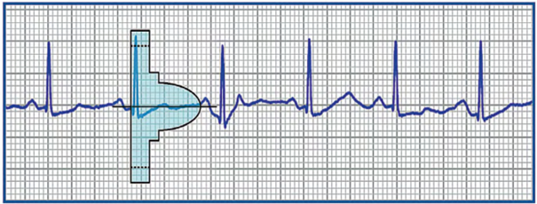 The ruler is positioned on the analyzed recording, initially searching for the color profile that best matches the amplitude of the QRS complex. The horizontal line is aligned with the isoelectric baseline and the left edge of the profile is aligned with the start of the QRS.