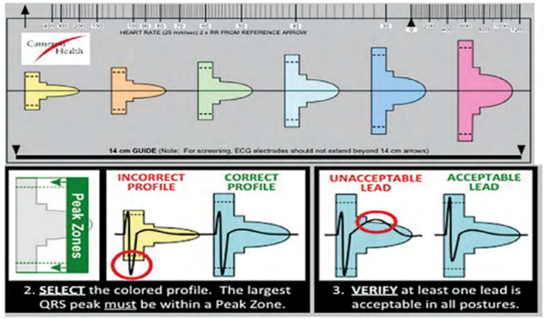 Preimplantation screening can be performed manually using a ruler supplied by Boston Scientific, which is very similar in format to a standard ECG ruler. This ruler (model 4744) includes markings for measuring heart rate (standard ECG ruler), a guide indicating the 14 cm measurement to be used for positioning surface electrodes during the screening test, and six colored profiles of different morphologies. Each color profile has an identical window above and below the baseline for analyzing positive deflections (R waves, P waves, T waves) and negative deflections (S waves, inverted T waves).