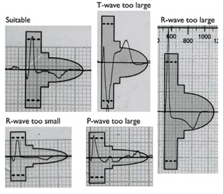 For the vector to be validated, the maximum amplitude of the QRS complex must fall within the window delimited by the dotted line and the peak of the colored profile, and the entire QRS complex and T wave must be contained within the colored profile. For biphasic (RS) signals, the largest peak must be used. These colored profiles correspond to the sensitivity modification profile subsequently used by the device for the shock zone. This is therefore the most sensitive profile, as the objective of screening is to place oneself in the “worst conditions” that maximize the risk of oversensing.