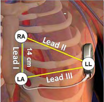 • Positioning of the three skin electrodes at the detection poles so as to mimic the three future vectors available once the device is implanted; the LL (Left Leg) electrode corresponding to the box must be positioned laterally at the fifth intercostal space (between the fifth and sixth ribs) on the left mid-axillary line; The LA (Left Arm) electrode corresponding to the proximal electrode must be positioned approximately 1 cm to the left of the xiphoid process of the sternum. The RA (Right Arm) electrode corresponding to the distal electrode must be placed 14 cm higher than the previous electrode on the left parasternal line (a guide indicating 14 cm is shown on the ruler provided by the manufacturer). A fourth electrode (ground) can be positioned away from these three electrodes (at the level of the right clavicle, for example).