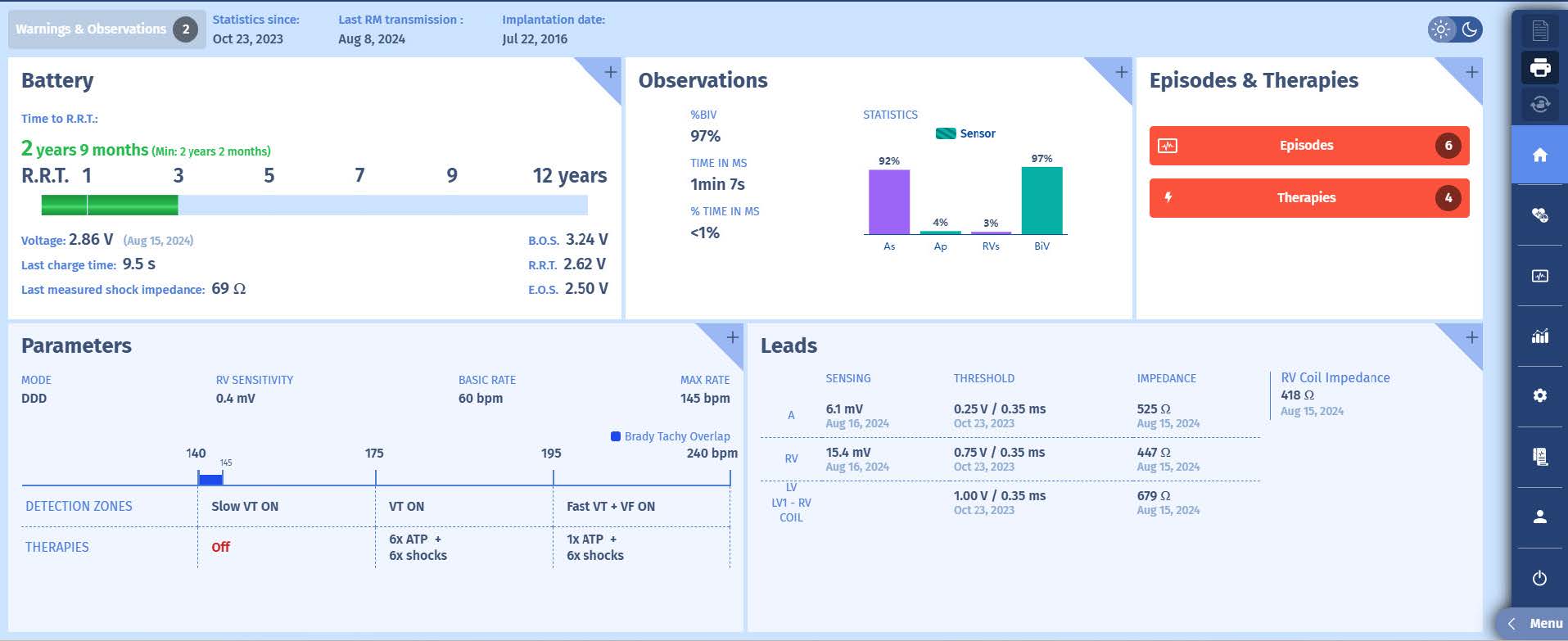 The initial rhythm is atrial sensing followed by biventricular pacing. Suddenly, a tachycardia initiates with fast ventricular and atrial rhythm with one-to-one (1:1) conduction. On the rate histogram we see that the VT continues and terminates after a second ATP.
