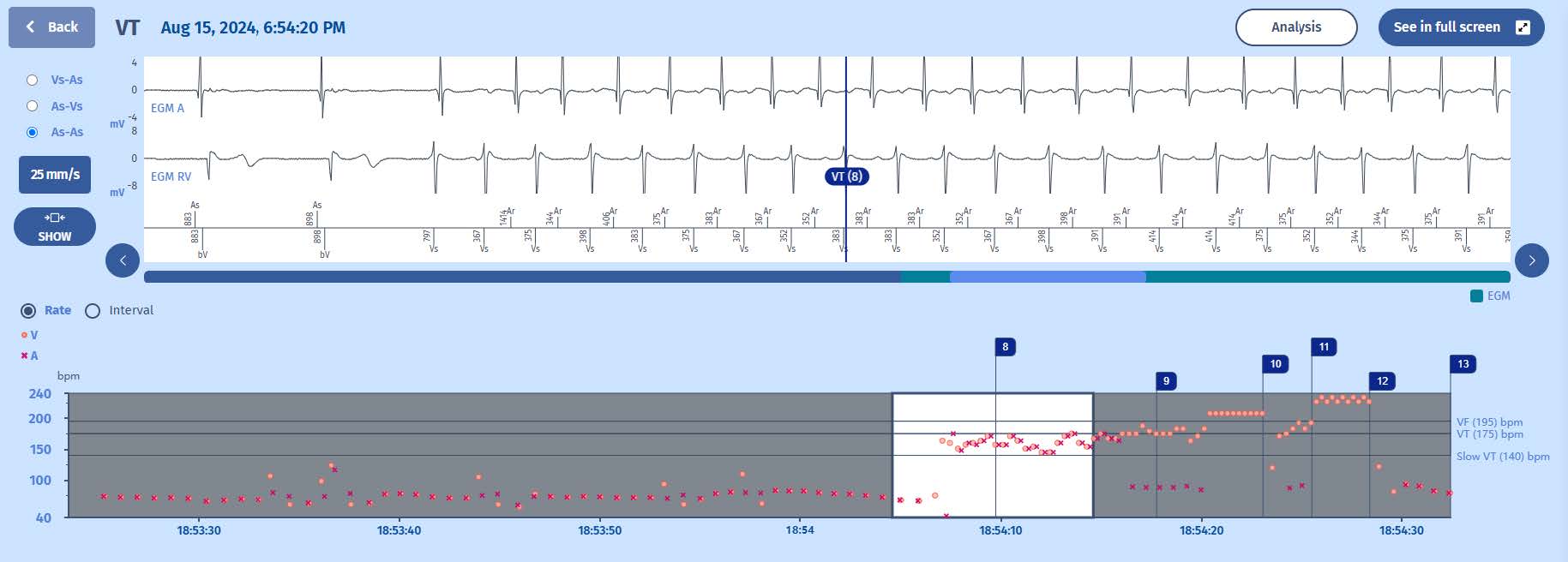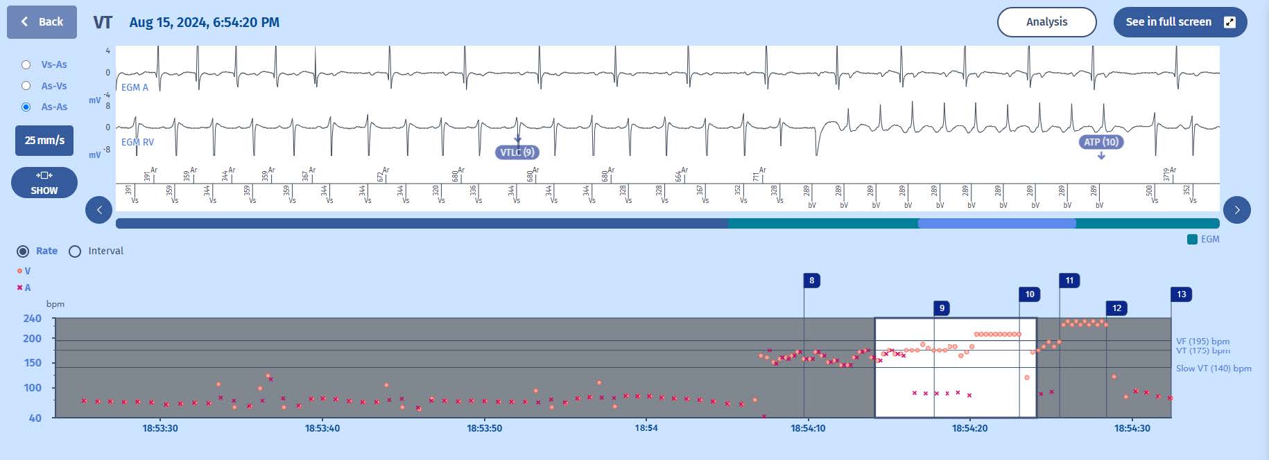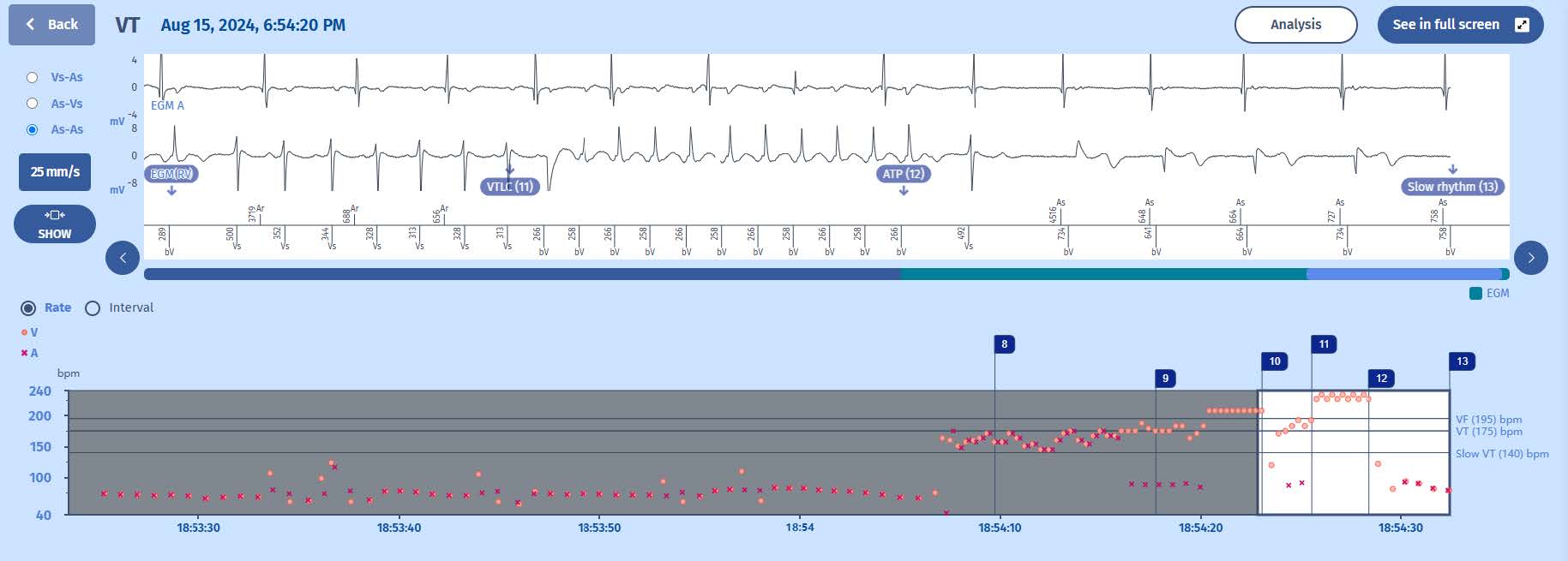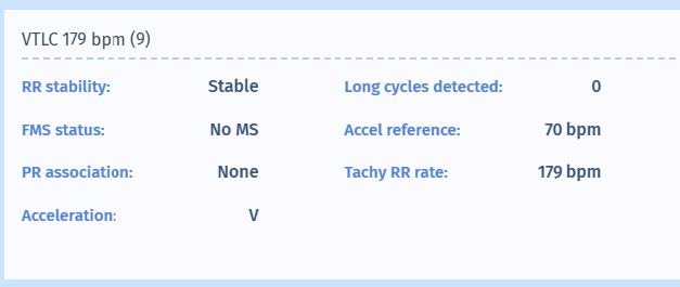 Notice how the marker changes from VT to VTLC. This is because the decision tree of the PARAD+ has changed. The retrograde (VA) conduction has diminished to a 2-to-1 fashion with loss of PR association. Therefore, the discrimination goes back to checking whether the ventricular rate is stable and VT is diagnosed. Again, the analysis button may help to better understand the PARAD+ algorithm, as it will display that the PR association is lost (“none”).