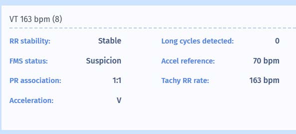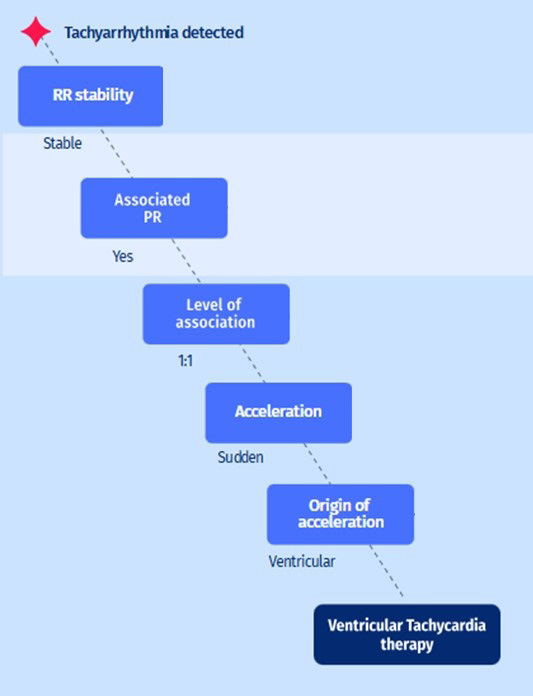 acceleration is sudden, because sinus tachycardia is a stable tachycardia with 1:1 PR association and this needs to be excluded to diminish the risk of inappropriate therapies. In this case, the onset is sudden with an acceleration from 70 bpm (reference) to 163 bpm (tachy RR rate). When sinus tachycardia has been excluded, there is a last step. Which is exclusion of atrial tachycardia; a tachycardia with sudden onset, is stable, is associated in a 1:1 fashion. The best way to exclude atrial tachycardia is to analyze which chamber was first to accelerate. For atrial tachycardia this will be the atrium. For ventricular tachycardia, the first chamber to accelerate is the ventricle. In this case, the ventricle has been correctly identified as the first chamber to accelerate.