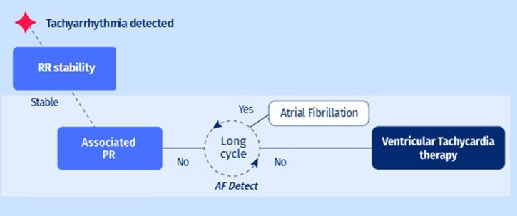 Ventricular tachycardias with one-to-one retrograde conduction to the atrium (1:1 VA conduction) are quite rare and difficult to distinguish by ICDs and need multiple criteria as they are stable (unlike AF), associated (unlike most VTs) with and onset which is sudden (unlike sinus tachycardia) and in the ventricle (unlike atrial tachycardia).