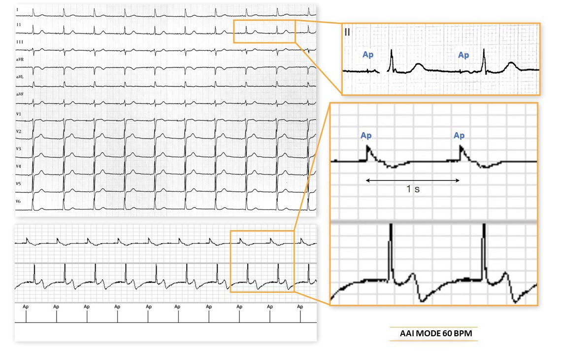 AAI mode 60 beats/minute: atrial pacing at the minimum rate (1 second escape interval) faster than the intrinsic sinus activity; intrinsic atrioventricular conduction;
