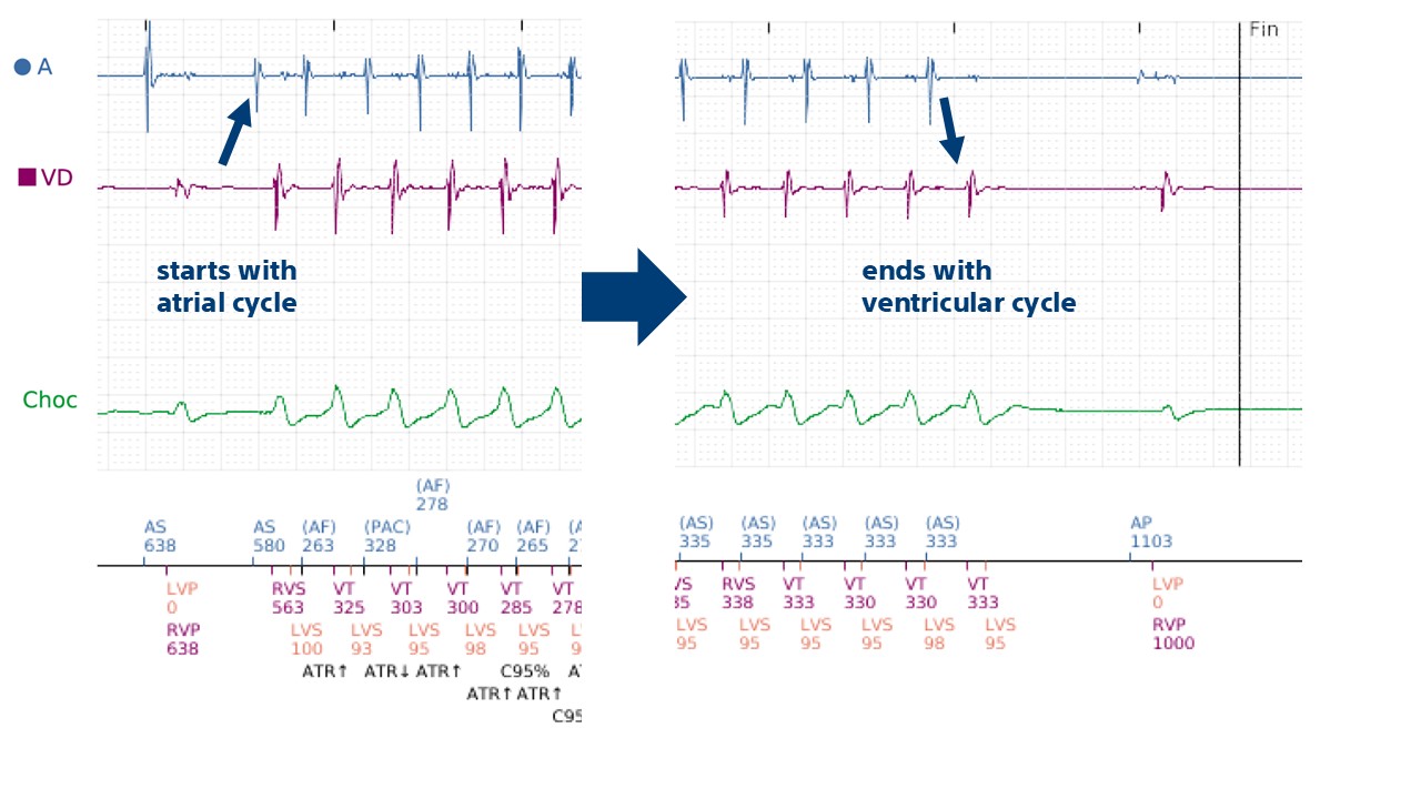 end of duration; RID- (less than 3 correlated cycles out of the last 10); stable rhythm and ATP burst