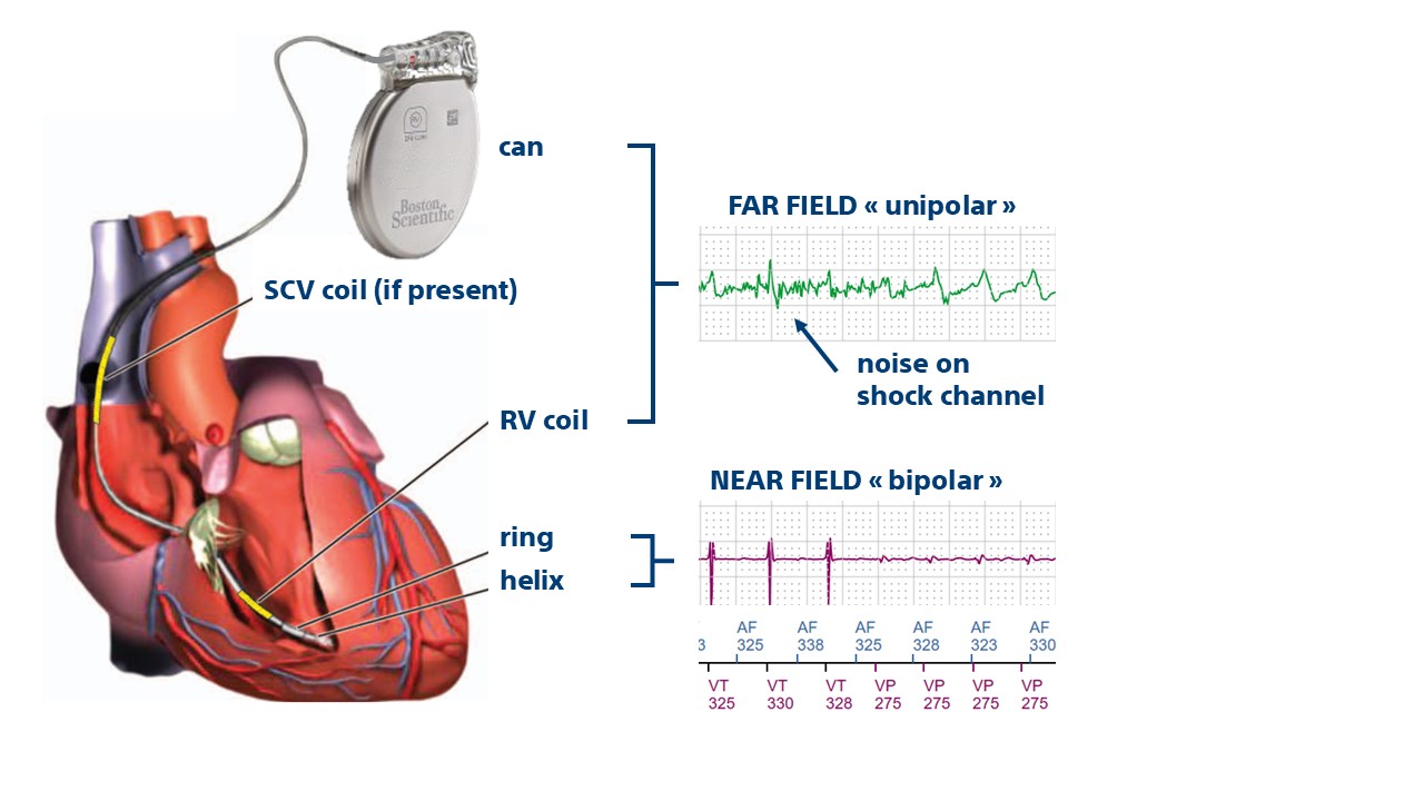 The shock channel is recorded between the RV coil and the defibrillator can located in the left pre-pectoral space; it is therefore a “unipolar” signal (only one electrode is located in the heart); this trace shows the poor quality on the shock channel signal due to oversensing of pectoral myopotentials which explains the lack of correlation with the reference ventriculogram and the occurrence of inappropriate therapies.