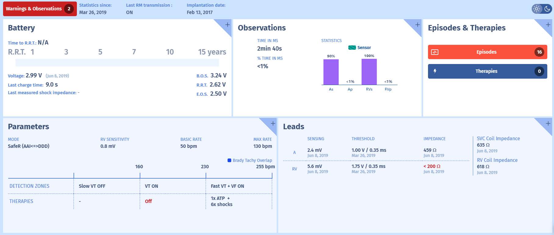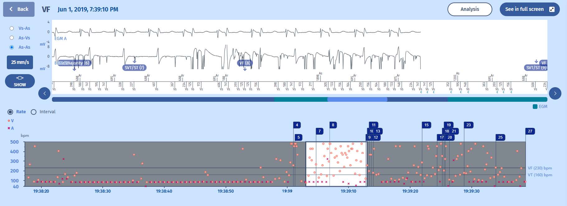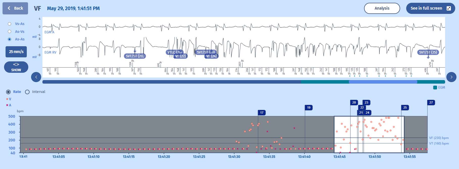 A 68-year old patient with ischemic cardiomyopathy has been implanted with a dual chamber ICD (Platinium DR). He presents for a routine check-up. He claims not to have any symptomes