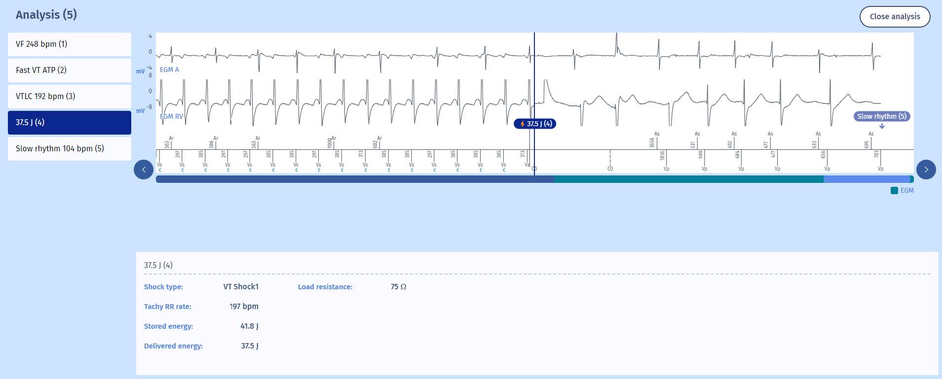 This is the reason why we can immediately observe shocks in the new zone since an ATP in the Fast VT zone had already been delivered. In the present example, the Fast VT ATP burst was immediately applied. With the tachycardia slowing down into the VT zone, it is the first shock of the VT zone which is called upon, as the ATP therapies are concluded (albeit in the VT zone).
