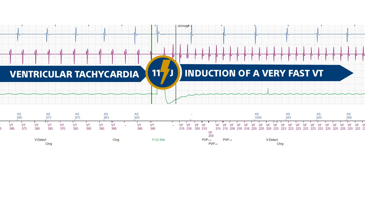 this tracing shows the main drawback of programming a low-amplitude shock (11 Joules) in the VT zone: pro-arrhythmogenic risk and acceleration of the arrhythmia (concept of upper limit of vulnerability); in this patient, the shock has the opposite effect to what was intended; below a certain value, which varies according to the patient and is directly linked to the defibrillation «threshold», not only can a shock prove ineffective in terminating an arrhythmia, but it can also accelerate and cause degeneration of a monomorphic VT into a polymorphic arrhythmia, compromising the patient’s short-term prognosis.