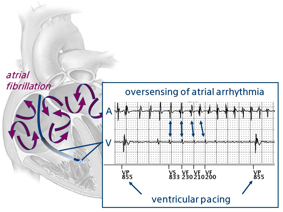 oversensing of an atrial arrhythmia can lead to both inappropriate therapy and asystole if the patient is pacing-dependent