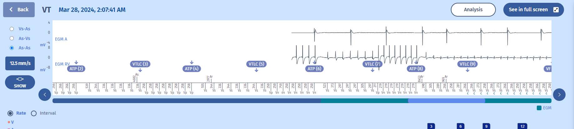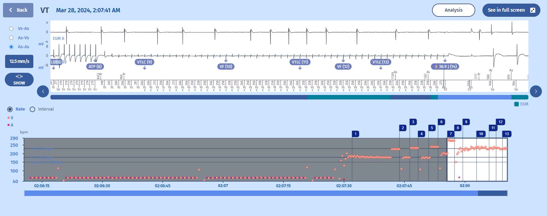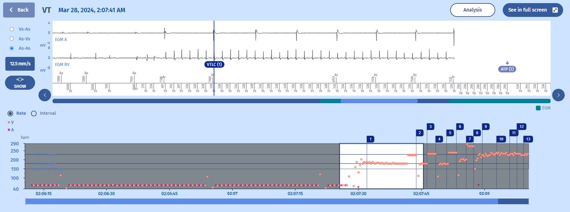 - The episode starts with a stable rhythm at 60 bpm when suddenly there is an acceleration of ventricular cycles into the VT zone (>180/min).