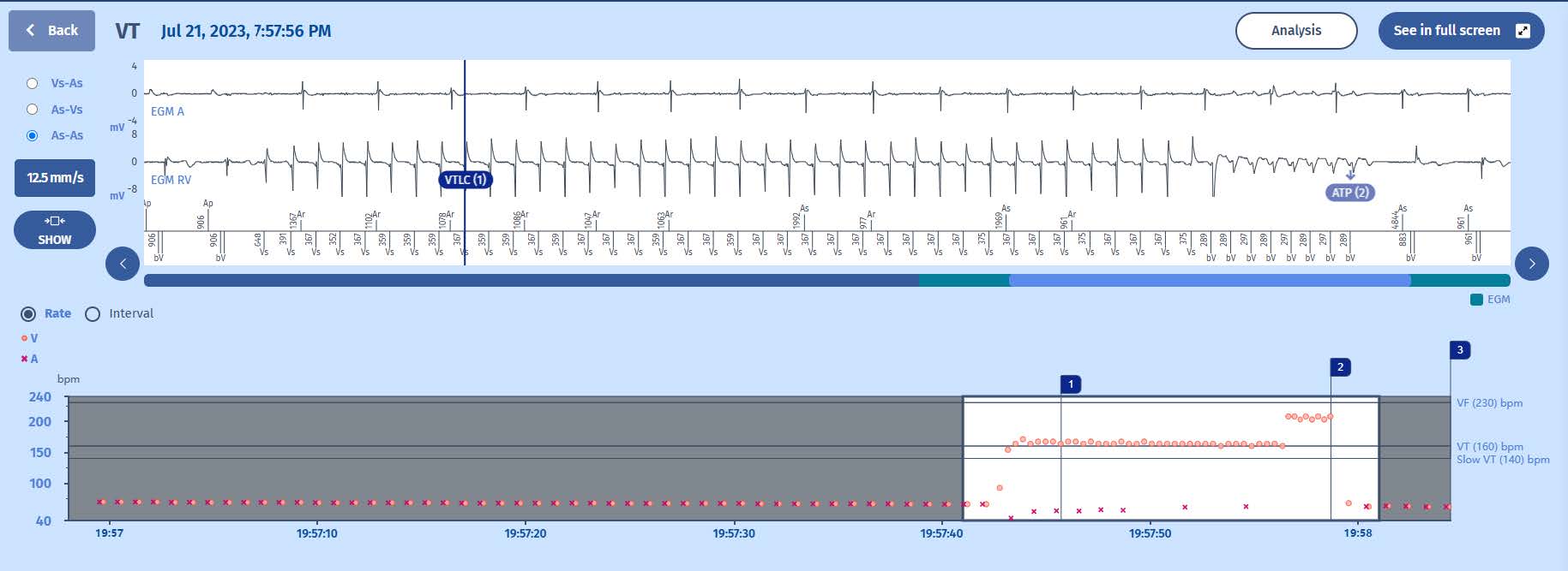 We can see that the ventricular rhythm was indeed considered as stable (PARAD+ step 1) and that there is no PR association (step 2). This is how the diagnosis of VT is made.