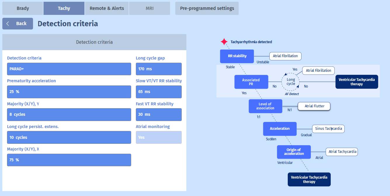We see that when a Tachyarrhythmia is detected, the PARAD+ will first check whether the rhythm is stable. Since AF is the most important supraventricular tachycardia to cause inappropriate therapies, this is the first step in the PARAD+ algorithm. The second step is to verify whether the atria and ventricles are associated. In the case of most VTs, there is no association and therefore this is a good criterion to distinguish between VT and SVT. To verify which route the PARAD+ algorithm took in this example, we can click on Analysis on the programmer screen and it will display the following information.