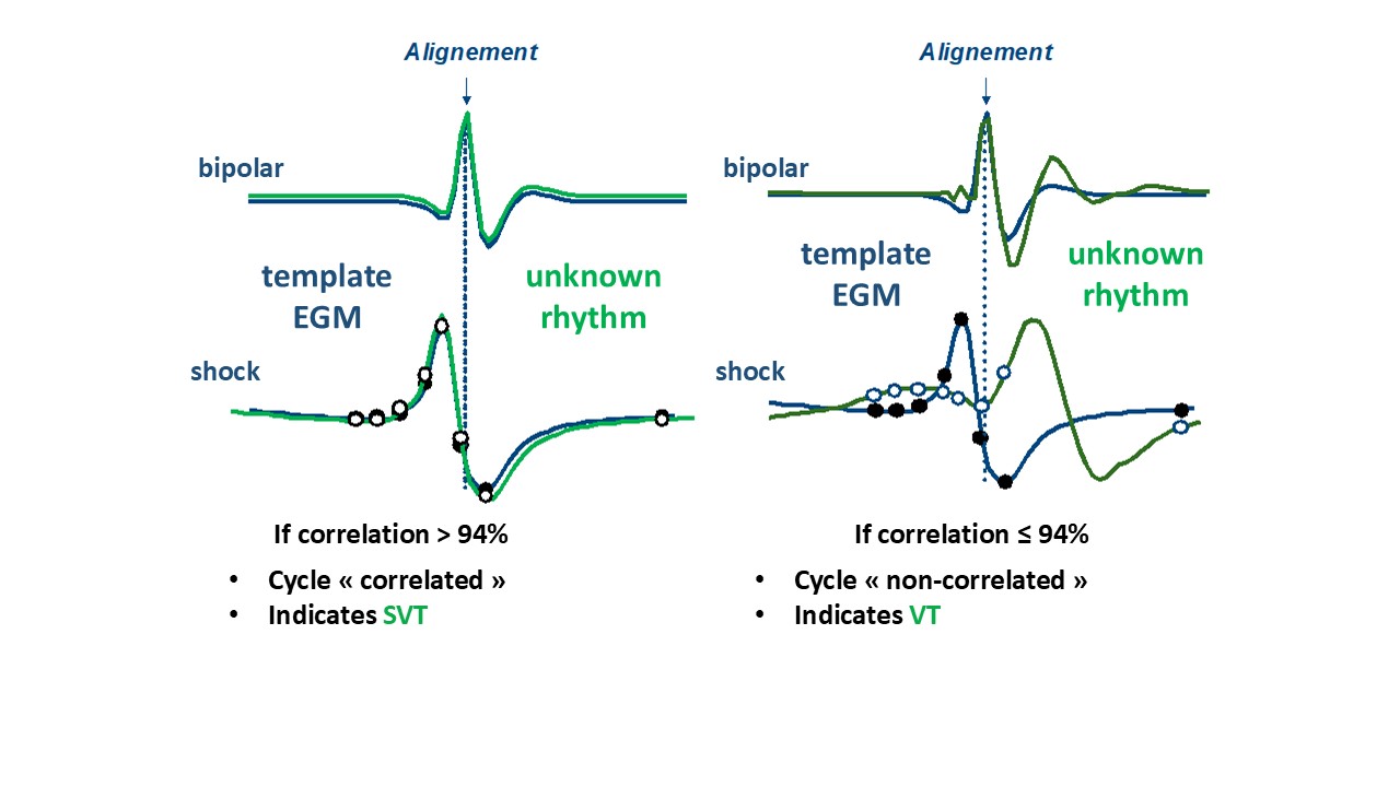 Operating principle of Rhythm-ID discriminantion: comparison between ventricular vectors in tachycardia and a reference vector; the bipolar sensing EGM enables alignment (localization of QRS peaks), and the comparison is made on the shock channel (decomposition of the QRS complex into 8 equidistant points).