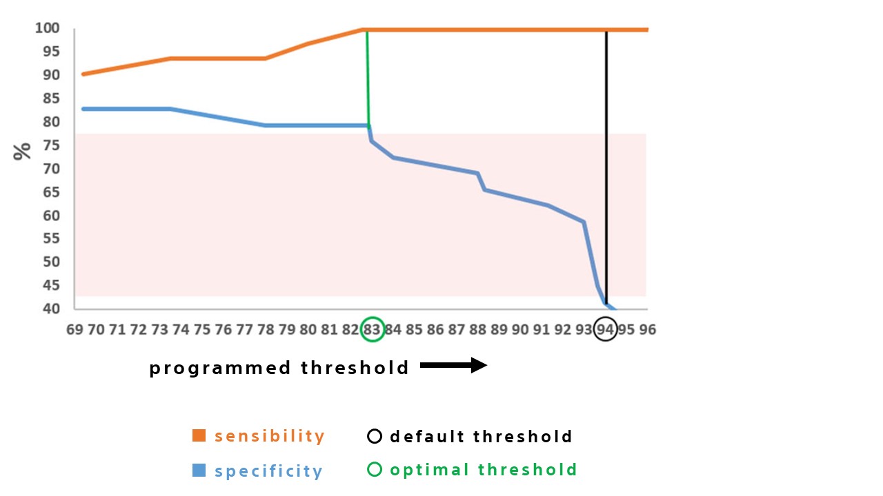 This figure shows the differences in specificity as a function of the programmed threshold value; sensitivity remains at 100% up to a value of 83%.