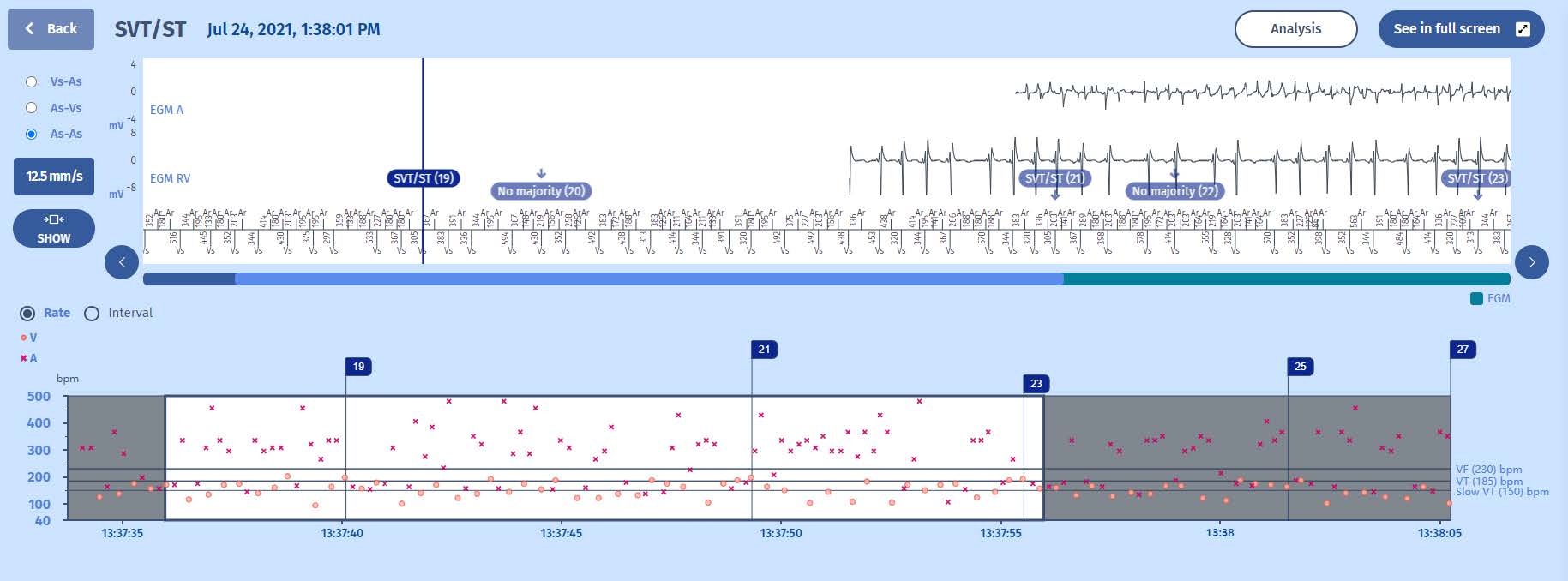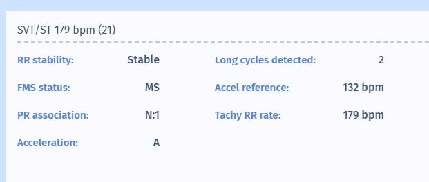 We can learn from the figure that marker 21 is considered as “Stable”. Fortunately, the PARAD+ has more criterion which protects against inappropriate diagnosis of VT in case of AF with rapid ventricular response. It is actually looking for atrioventricular association and in this case, finds that the relation is N:1, declaring it as supraventricular. It also correctly identified the origin of the tachycardia as atrial, which can also help in correctly discriminating the episode as