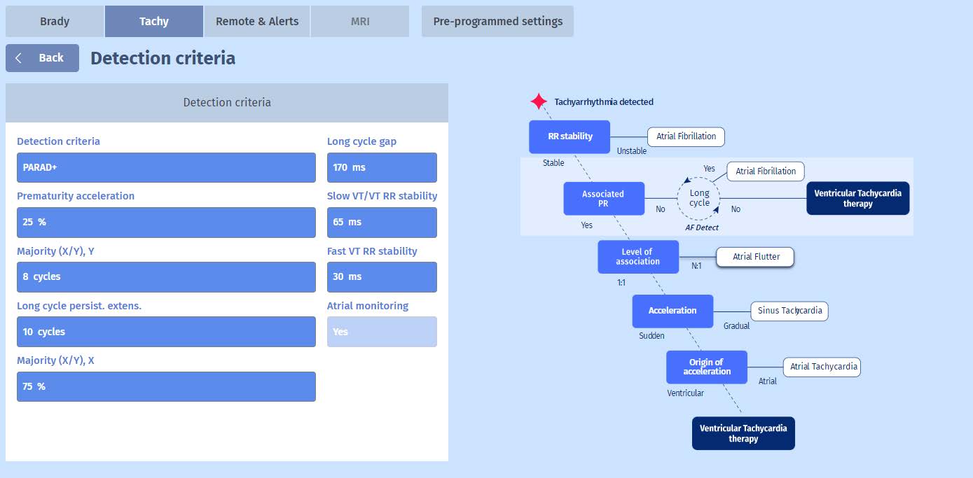We can appreciate the importance of “Stability” in the PARAD+ discrimination algorithm tree on the right of the figure, as it is the first step. When the VT criteria are met but RR is instable, it is considered as AF, the episode is saved as “SVT/VT” and therapy is withheld. This also holds true for slow VT zones without therapies, such as in this case. As the episode continues, we can imagine that in some instances, the rapid ventricular events in fact become stable enough to not cross the 65 ms threshold. This is indeed true in this episode for example for marker 21.