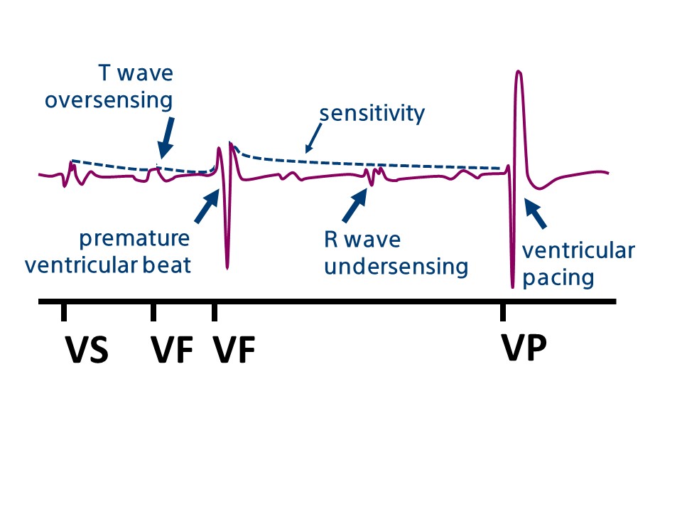 T wave oversensing is associated with a typical alternation between 2 morphologically different signals, a high-frequency signal (R wave) and a low-frequency signal (T wave); for each cardiac cycle, the device counts the R wave and then the T wave as a second additional signal, resulting in a doubling of the heart rate; the alternating cycle length (RT intervals and TR intervals) is generally marked for slow heart rates (short RT intervals and long TR intervals) but is often less marked during exercise (RT and TR intervals approximately equivalent) or for patients with a long QT