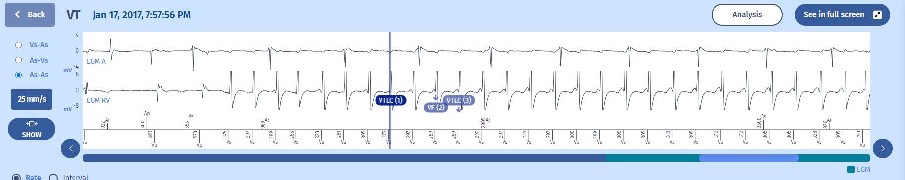 A 66-year-old man implanted with Platinium DR for dilated ischemic heart disease without prior infarction and ejection fraction of 28%, narrow QRS, in secondary prevention. Follow-up control. Asymptomatic patient.