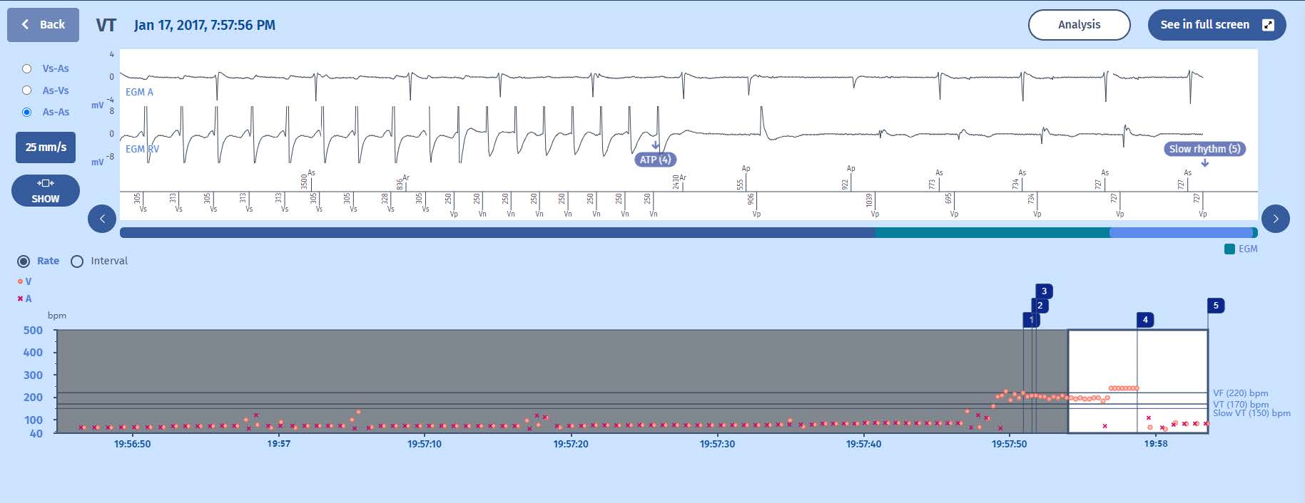 2 A tachycardia begins, ventricular in nature since the atrial rate remains slow, with some cycles in the VF zone, although the rhythm is predominantly VT with a first VTLC marker, and therefore, a persistence of 20 cycles is started.