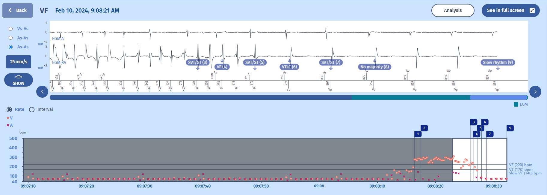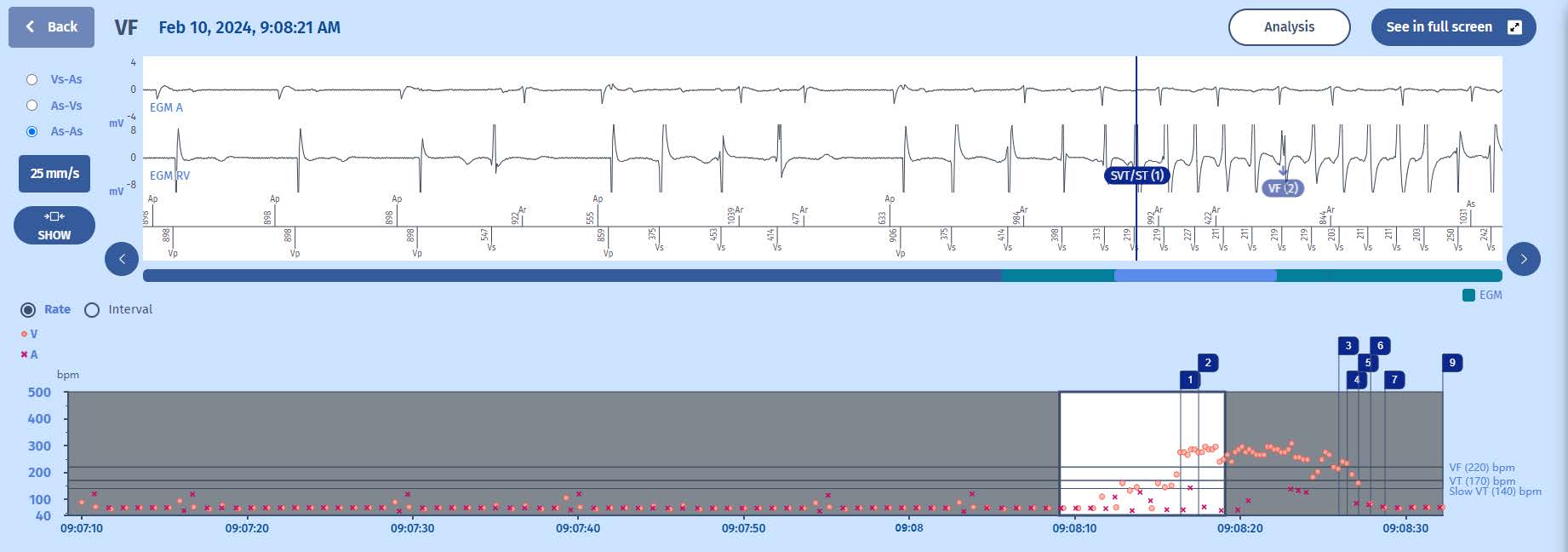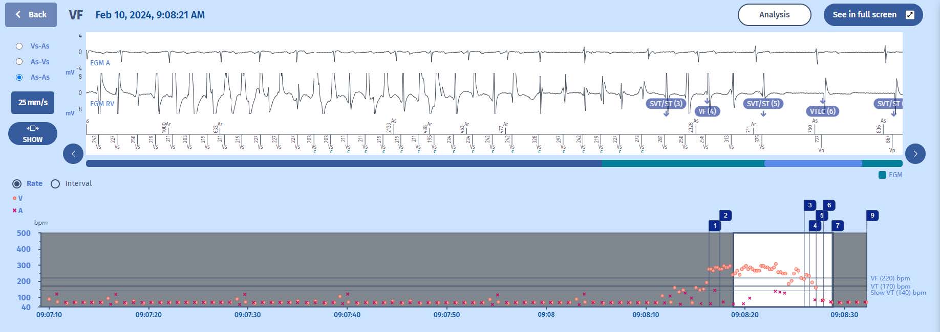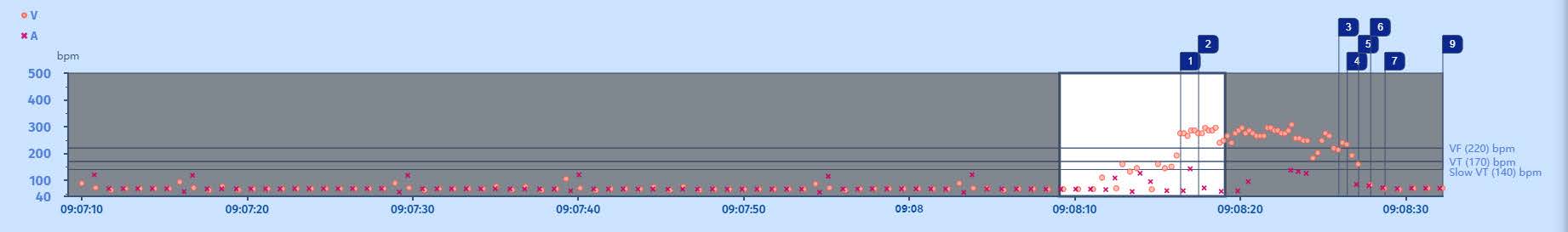 The interval plot shows a stable and slow rhythm (probably paced) with some extrasystoles when suddenly there is a ventricular arrhythmia in the VF zone (>220/min). As the ventricular arrhythmia accelerates into the VF zone. After a while the arrhythmia slows down, becomes more irregular and self-terminates.