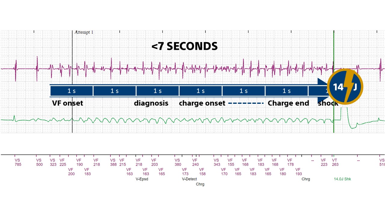- the programming in this young patient may seem surprising, with an initial duration in the VF zone of 1 second; this patient initially presented with traumatic syncope and to avoid future falls, a decision was made to deliver the shock before loss of consciousness; the interval between the onset of arrhythmia and the shock was around 6 seconds (approx. 2 seconds for the 8 initial cycles, initial duration of 1 second, charge time of 2.7 seconds, diversion window of 500 ms)