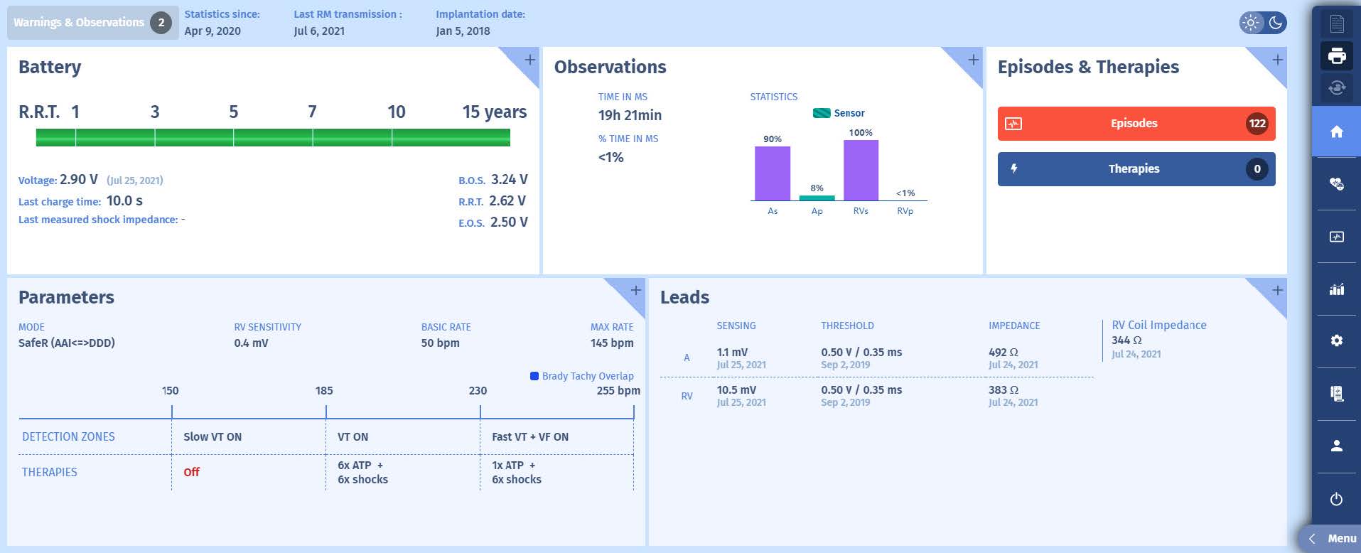 This is a long episode so only snippets of EGM are made available but it shows the same features as seen in the interval plot; the appearance of gradually faster ventricular events. As it is a single-chamber ICD with only a ventricular lead, we do not see an atrial channel. Where we would normally see an atrial channel, we now see a far field channel between the can and the RV coil, which is similar to a surface ECG. On this channel we can appreciate more of the QRS morphology and compare it to other episodes or live EGM which in this case is identical. This confirms the diagnosis of inappropriate therapies for sinustachycardia misdiagnosed as VT. While competitors use this information as a criterion for discimination (with varying results), it is not the case for