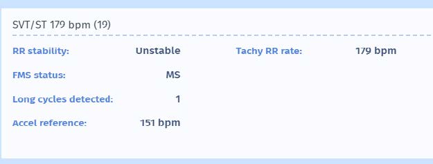 MicroPort devices, which rely on atrial leads for discrimination, and in absence of atrial leads, rely on sudden onset and stability criteria. In this case we can see that while initial diagnosis markers of SVT appear, the long intervals (post compensatory pauses after premature ventricular complexes) make the ICD believe that there is a sudden onset of VT (which is not the case). As the tachycardia is within the VT zone (>170/min), stable and considered as sudden onset, it is diagnosed as VT. As these three features do not change during the persistence, the therapies will keep being delivered until the ventricular rate slows down out of the VT zone. This is problematic as the sinus tachycardia tends to accelerate when a patient suffers from shocks.